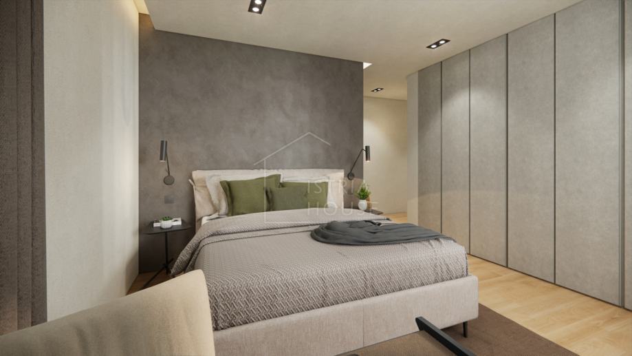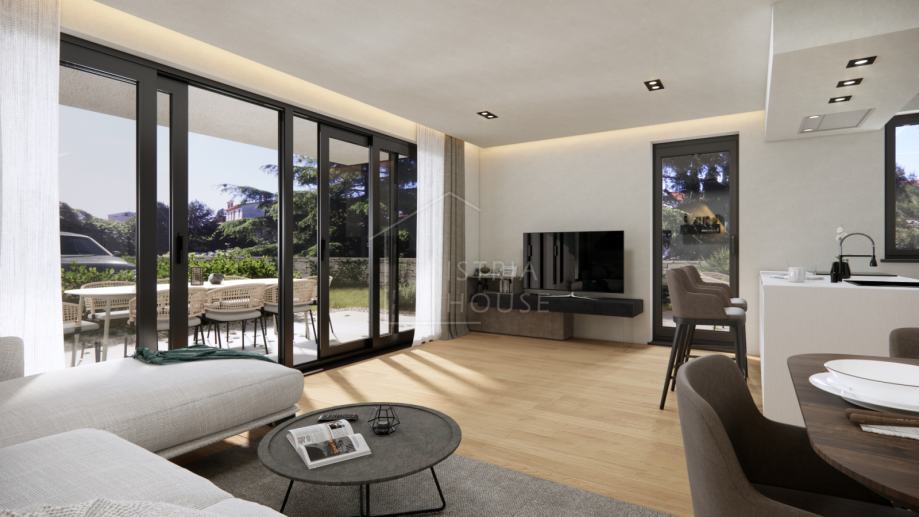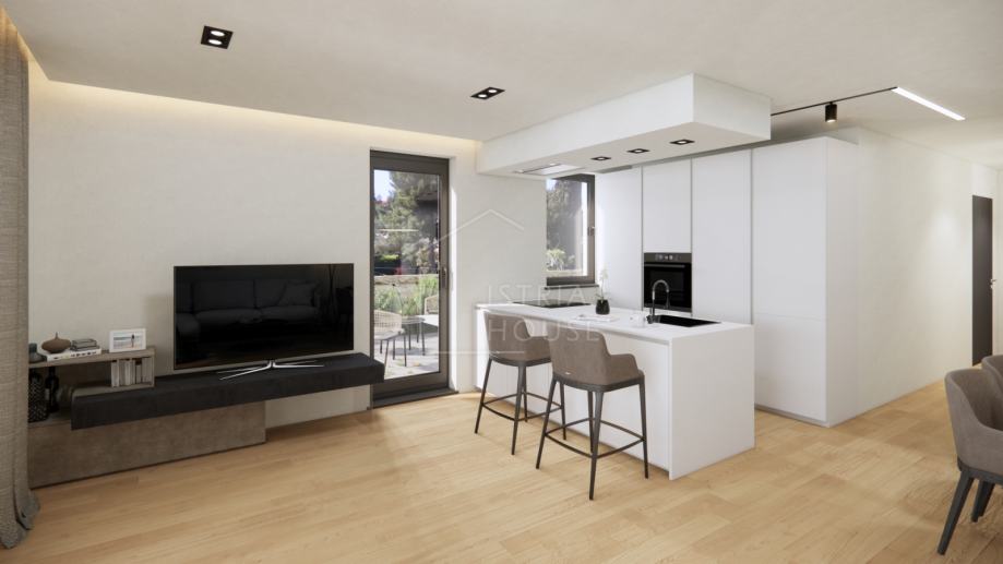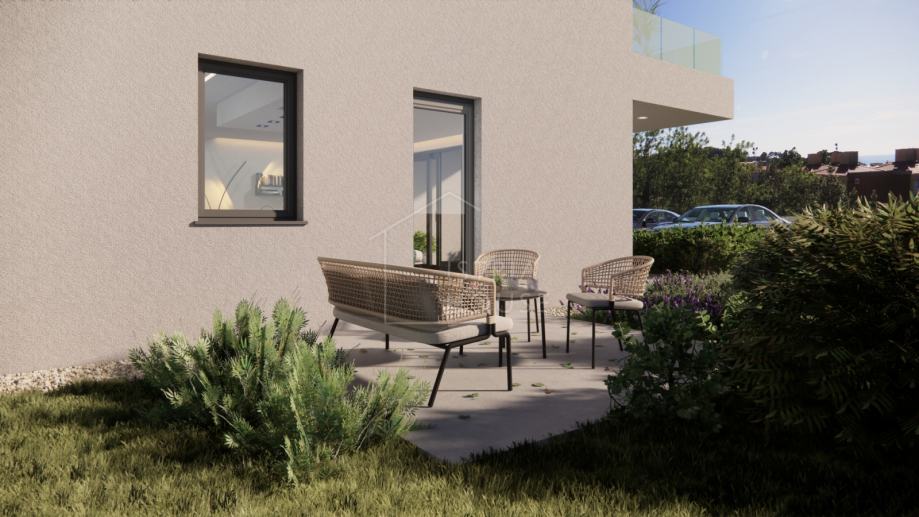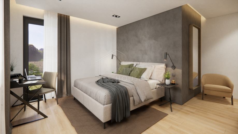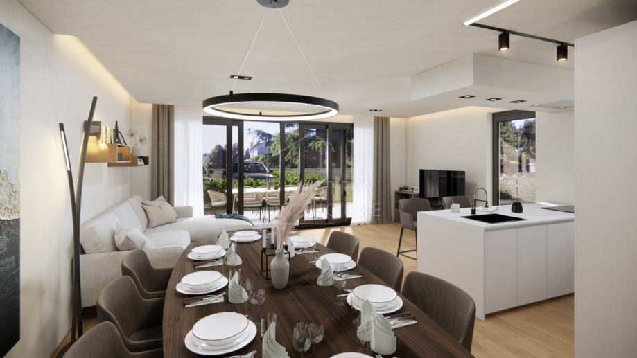sobe, svaka sa svojom kupaonicom i garderobom. Kuhinja , blagavaona i dnevni boravak čine jednu prostoriju okrenutu prema vanjskoj svjetlosti, odnosno prema terasi i prema vrtu koji pripada stanu. Stan ima još gostinjski wc, garažu, ostavu te vanjsko parkirno mjesto.