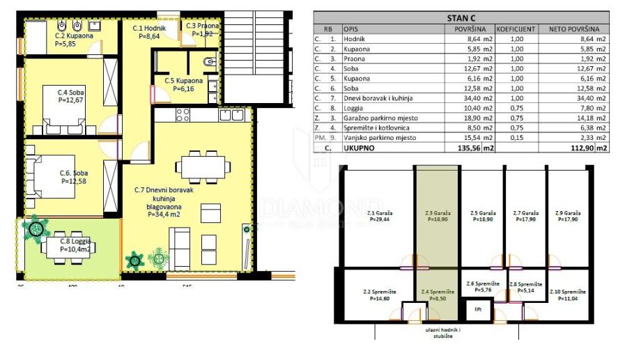 Ovaj luksuzni stan je pravi dragulj. Ukupna neto površina stana iznosi 112.90 četvornih metara, dok ukupna bruto površina iznosi 135.56 četvornih metara. Stan se sastoji od prostranog ulaznog hodnika, moderno uređene kupaonice, praonice i otvorenog prostora koji objedinjuje kuhinju, blagovaonicu i dnevni boravak s izlazom na prekrasnu loggiu. Također nudi dvije prostrane spavaće sobe, od kojih jedna ima vlastitu kupaonicu, a druga ima izlaz na istu prekrasnu loggiu.