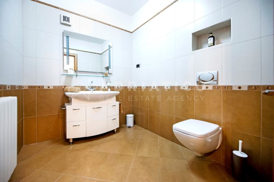- u prizemlju ćete osim prostranog i potpuno opremljenog apartmana pronaći i konobu s kuhinjom i toaletom koja je opremljena svim sadržajima za ugodno druženje. I konoba i apartman pružaju izravan izlaz na natkrivenu terasu ispred koje se prostire impozantan grijani bazen od 32m2 sa sunčalištem i vanjskom kuhinjom. U drugom dijelu prizemlja nalazi se i velika garaža za 2 automobila;
