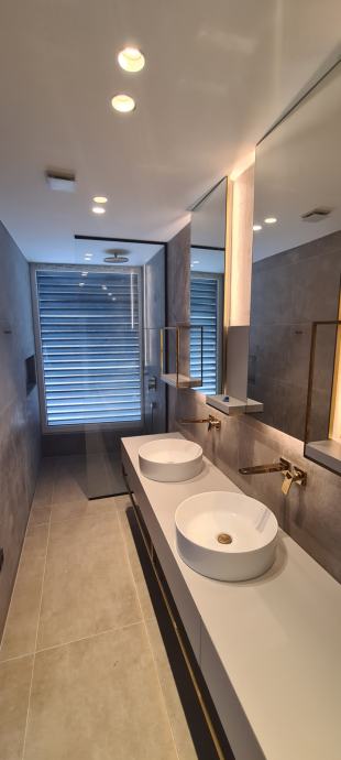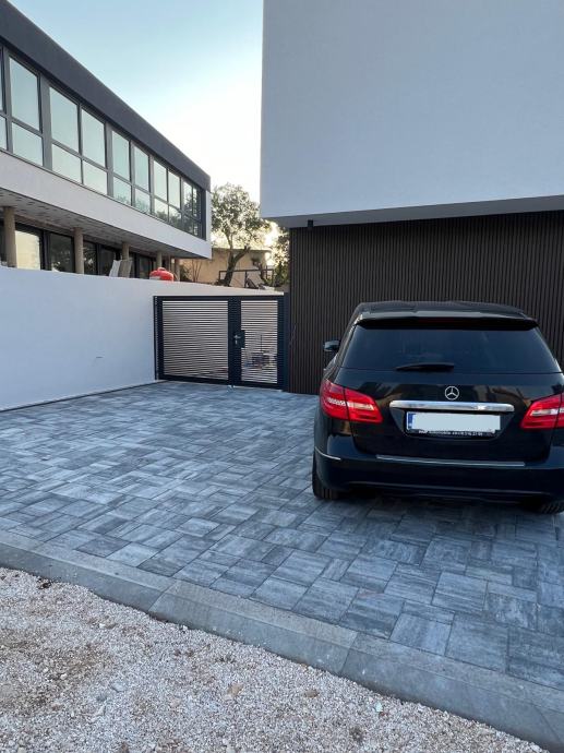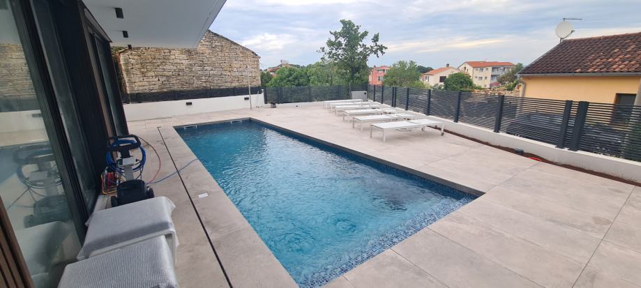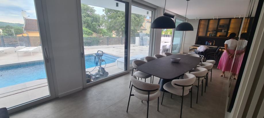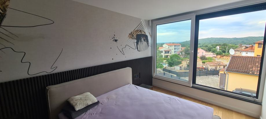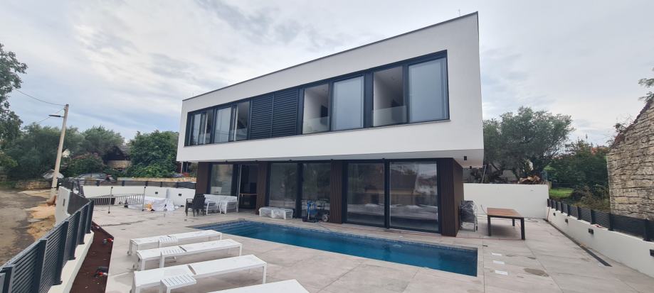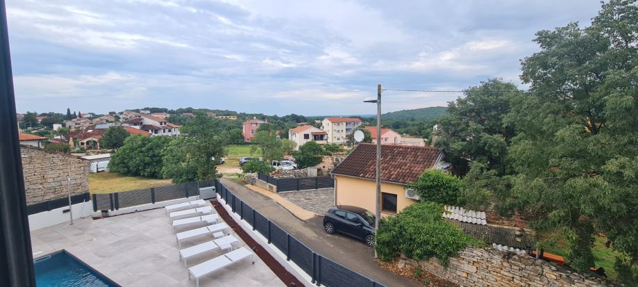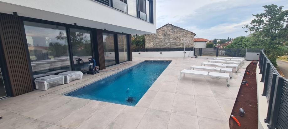 Rovinjsko selo, svega 5 kilometara do centra Rovinja, u pitomom i mirnom okruženju auktotonih i modernih kuća na brežuljku s pogledom u blizini svih sadržaja za ugodno življenje, nudimo besprijekornu modernu dvoetažnu VILLU s grijanim vanjskim bazenom, koja se u prizemlju sastoji od ulaznog prostora, prostranog dnevnog boravka, blagovaonice, moderne kuhinje iz kojih se prostire pogled kroz brutalno velike staklene podizno klizne stijene prema vanjskom grijanom bazenu sa slanom vodom, popločenom i hortikulturno uređenom dvorištu te kućama i zelenilu u daljini. U prizemlju imamo i gostinjski WC te gospodarsku prostoriju u kojoj se nalazi dizalica topline, vešmašina i sušilica rublja. Iz prizemlja se prostiru moderne, osvijetljene drvene stepenice koje vode na 1. kat moderne VILLE, gdje imamo centralni hodnik iz kojeg se ulazi u spavaće sobe a iz svake sobe u svoju kupaonu. Sve četiri spavaće sobe te četiri kupaone su potpuno opremljene i odišu potpunim modernizmom, luksuzom, svjetlinom i prozračnošću a iz svake sobe se prostire impresivan pogled.
