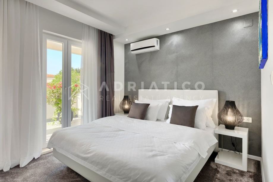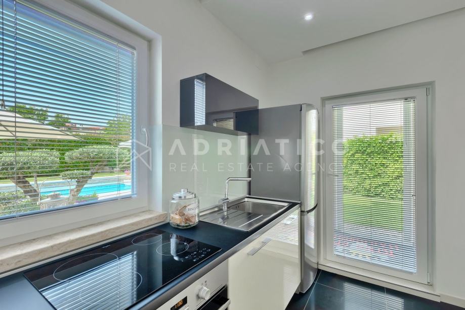 Prizemlje: Ulazni hodnik, kuhinja s blagovaonicom, dnevni boravak s izlazom u dvorište, koje uključuje veliki bazen (42 m²), ljetnu kuhinju, jedna spavaća soba s vlastitom kupaonicom te jedan toalet