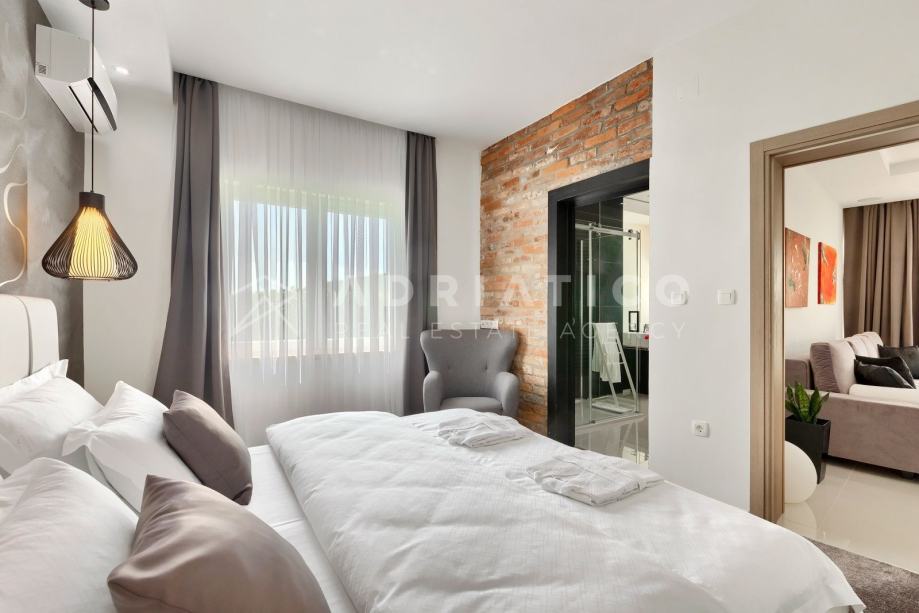 Prvi kat: Dvije spavaće sobe, svaka s vlastitom kupaonicom i izlazom na terasu.