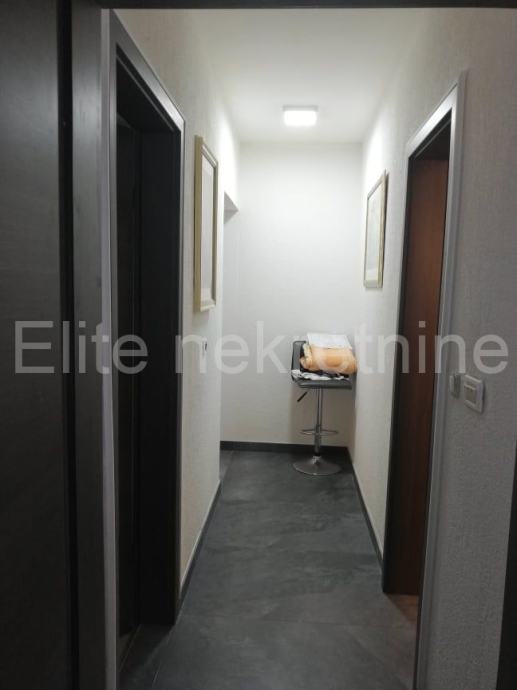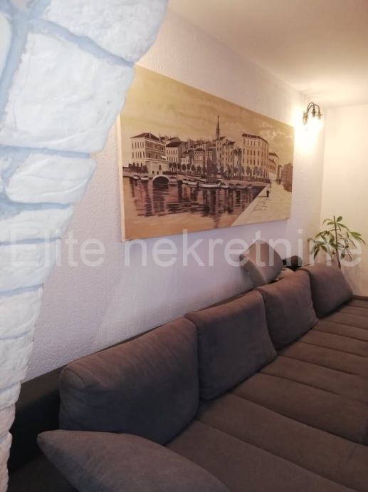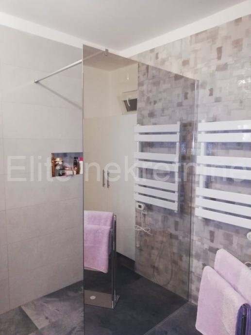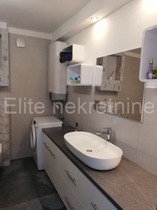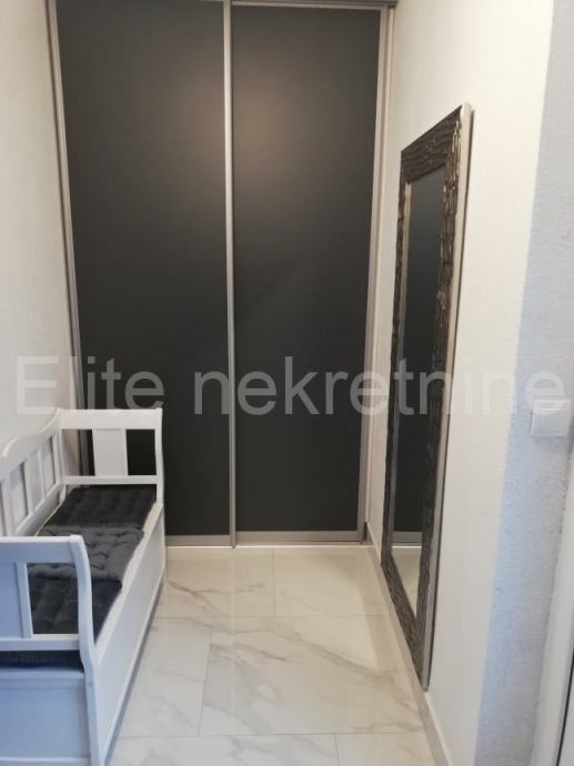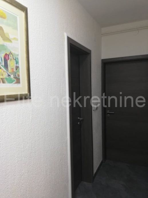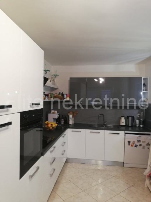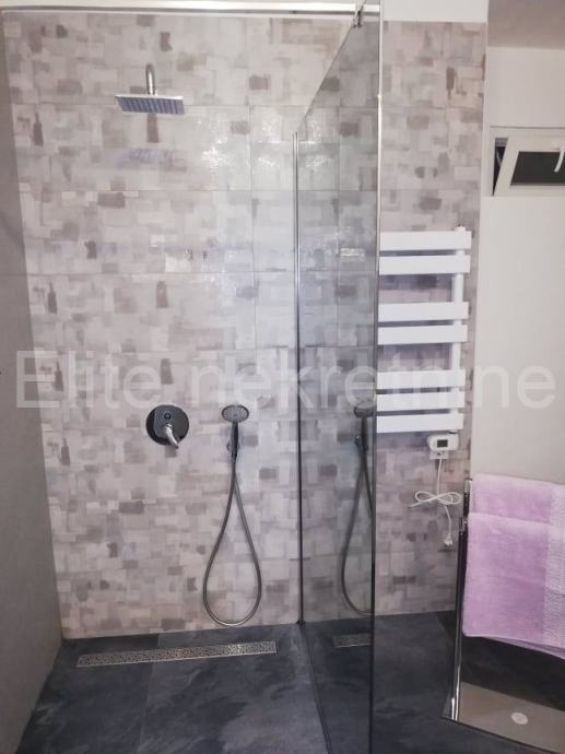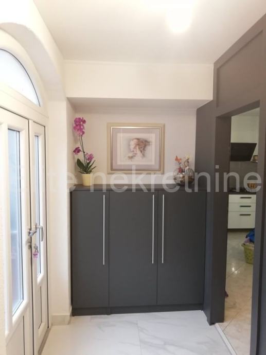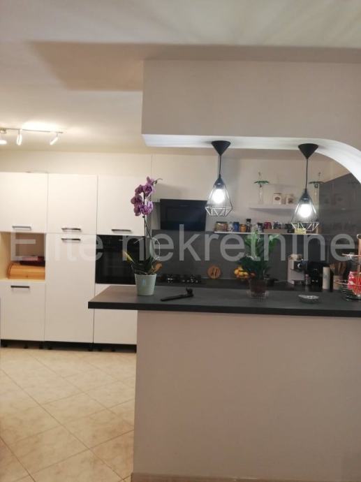 Sastoji se od lijepog ulaznog prostora s garderobom, kuhinje sa šankom, blagovaone i otvoreni dnevni boravak, predsoblje, 2 spavaće sobe, prostrane kupaonice te ima veliku popločenu terasu s izlazom u privatni mali vrt. Pripada mu i spremište od 10 m2 u podrumu zgrade.