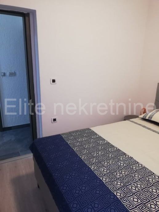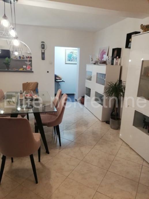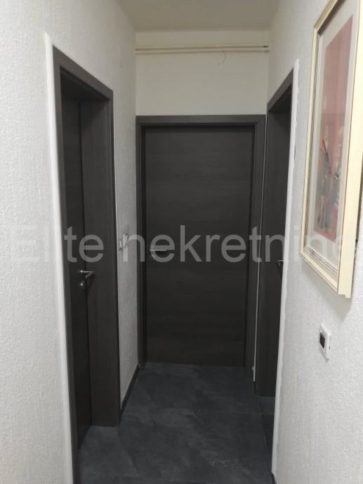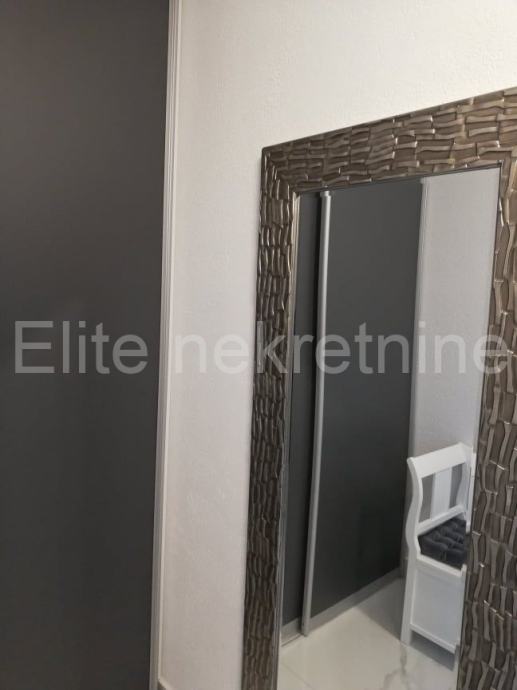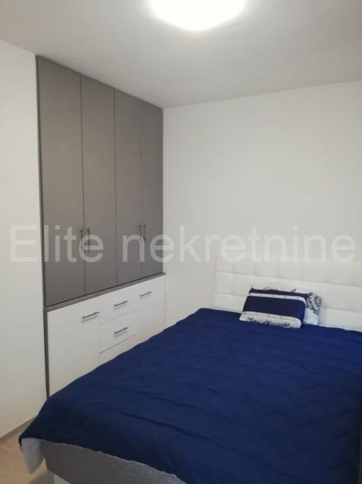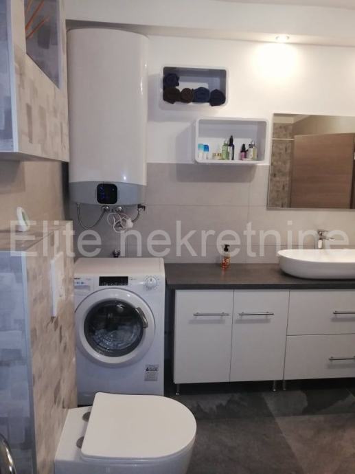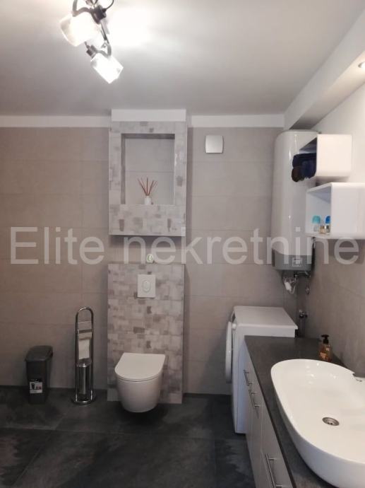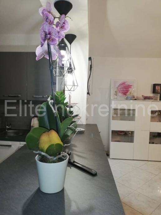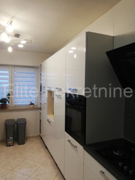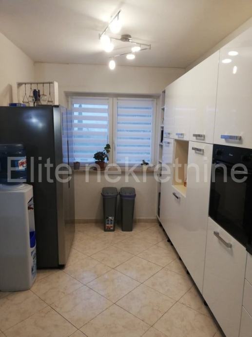 Sastoji se od lijepog ulaznog prostora s garderobom, kuhinje sa šankom, blagovaone i otvoreni dnevni boravak, predsoblje, 2 spavaće sobe, prostrane kupaonice te ima veliku popločenu terasu s izlazom u privatni mali vrt. Pripada mu i spremište od 10 m2 u podrumu zgrade.