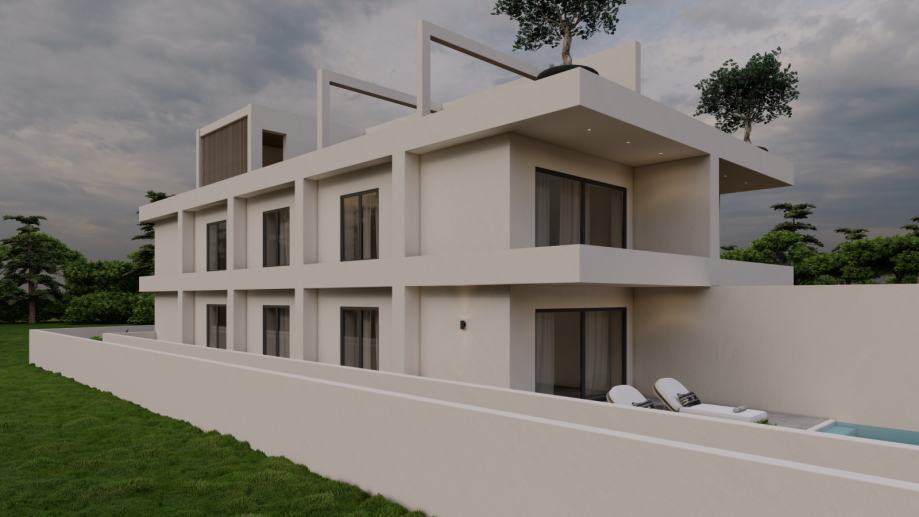 Na prodaju su luksuzni apartmani u novogradnji u mjestu Rtina nedaleko od Zadra. Zgrada je smještena u 1.redu od mora. -U prizemlju zgrade su dva dvosobna apartmana svaki sa pripadajućim bazenom i vrtom s roštiljem. Stanovi se sastoje od open space dnevnog boravka s kuhinjom i blagovaonicom, dvije spavaće sobe s kupaonicom,hodnika, zasebne kupaonice, te natkrivene terase .Svakom stanu pripadaju dva parkirna mjesta. Gradnja ove odlične zgrade je izvršena punim betonom u kombinaciji ciglenim termo blokom. Fasada ima termoizolaciju od stiropora debljine 10 cm. Prozori su od PVC materijala s troslojnim staklom , električnim roletama i komarnicima ,ulazna vrata Alu 95 Schuco s elektro otvaranje tipkovnica, otisak prsta . Podne obloge su visokokvalitetne pločice te sobe i dnevni boravak parket . Svi prostori su klimatizirani. U cijelom stanu je provedeno podno grijanje na struju. Svi stanovi imaju predivan pogled na more. Za više informacija stojimo na raspolaganju