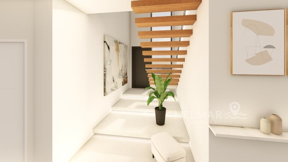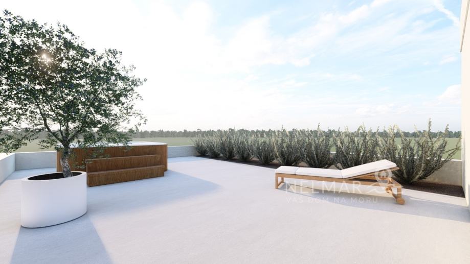 Upstairs there are two additional bedrooms, ideal for guests or family members, and an additional bathroom with toilet. Each room on the first floor provides plenty of natural light and direct access to two spacious terraces, each measuring 40 m2. The southern terrace offers a beautiful view of the sea, while the northern terrace offers a unique panoramic view of the sea and the magnificent Velebit. The project includes a connection for solar panels on the roof.