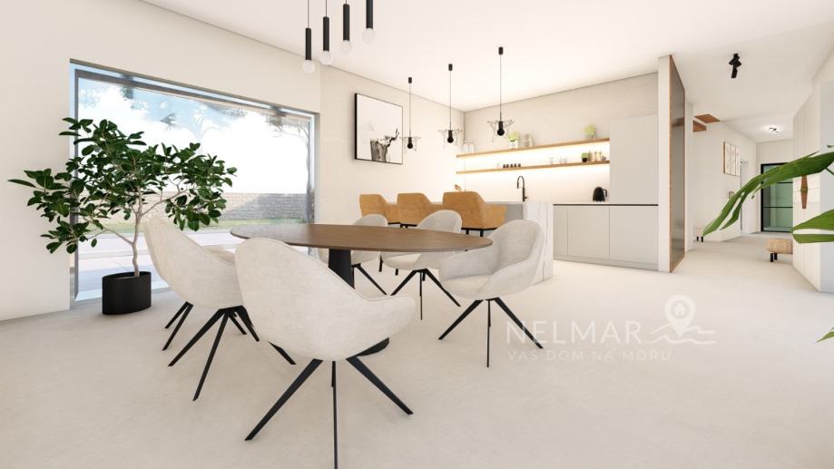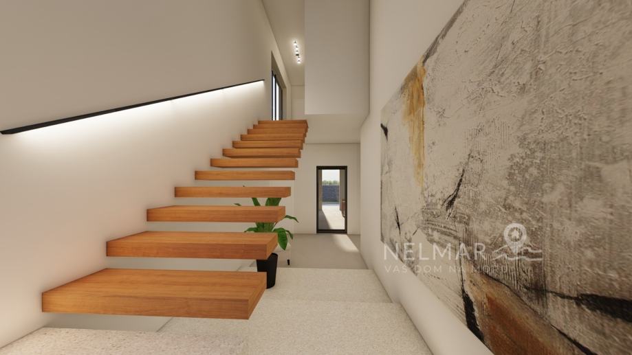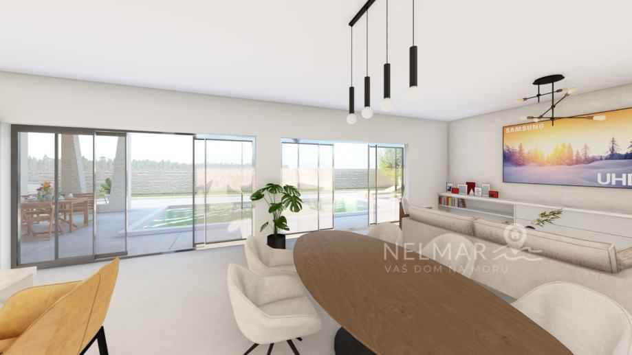 U prizemlju se nalazi glavna spavaća soba s vlastitom kupaonicom i WC-om, nudeći vam prostor za privatnost i opuštanje. Veliki dnevni boravak, povezan s kuhinjom i blagovaonicom u otvorenom konceptu, postaje središnje mjesto za okupljanje obitelji i prijatelja. Iz dnevnog boravka izlazite ravno na terasu s bazenom, što vam omogućava uživanje u suncu i vodi tijekom cijelog ljeta. Garaža površine 27,5 m2, koja je u sklopu vile, pruža sigurno mjesto za vaše vozilo i dodatni prostor za pohranu. Projektom je predviđen i brzi punjač za električne automobile unutar garaže.