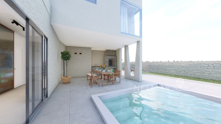 Vanjski prostor je osmišljen za uživanje na otvorenom – uz bazen dimenzija 8×4 m smješten je i prostor za vanjsku kuhinju s kaminom, savršen za ljetne večeri uz roštilj.