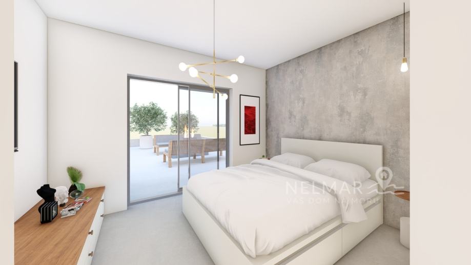 Im Obergeschoss befinden sich zwei weitere Schlafzimmer, ideal für Gäste oder Familienmitglieder, und ein zusätzliches Badezimmer mit WC. Jeder Raum im ersten Stock bietet viel Tageslicht und direkten Zugang zu zwei großzügigen Terrassen mit jeweils 40 m². Die Südterrasse bietet einen wunderschönen Blick auf das Meer, während die Nordterrasse einen einzigartigen Panoramablick auf das Meer und das herrliche Velebit-Gebirge bietet. Das Projekt beinhaltet einen Anschluss für Solarmodule auf dem Dach.