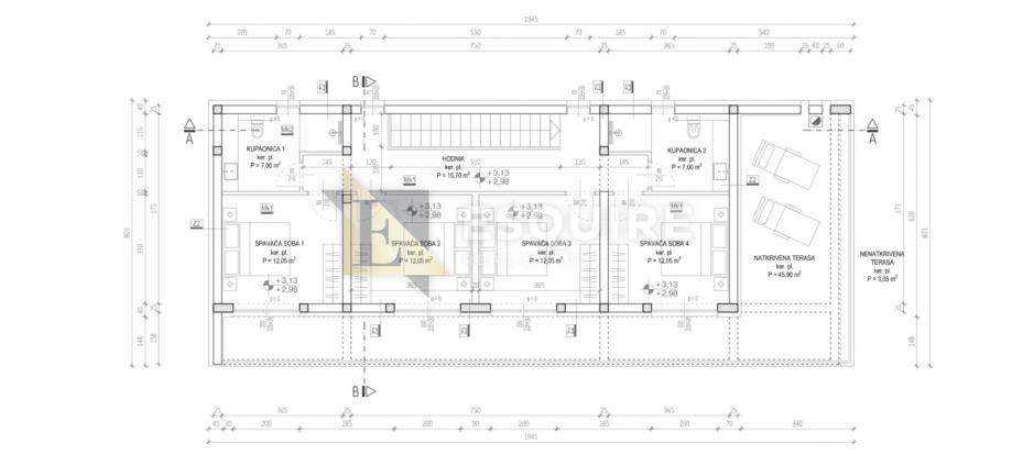 *Na katu se nalaze četiri spavaće sobe, od kojih jedna ima vlastitu kupaonicu, dodatna kupaonica, hodnik i natkrivena terasa.