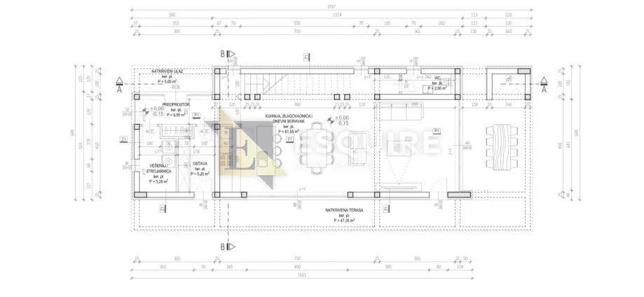*Prizemlje uključuje kuhinju s blagovaonicom, dnevni boravak, terasu, natkrivenu terasu, hodnik, WC, ostavu, vešeraj i strojarnicu.