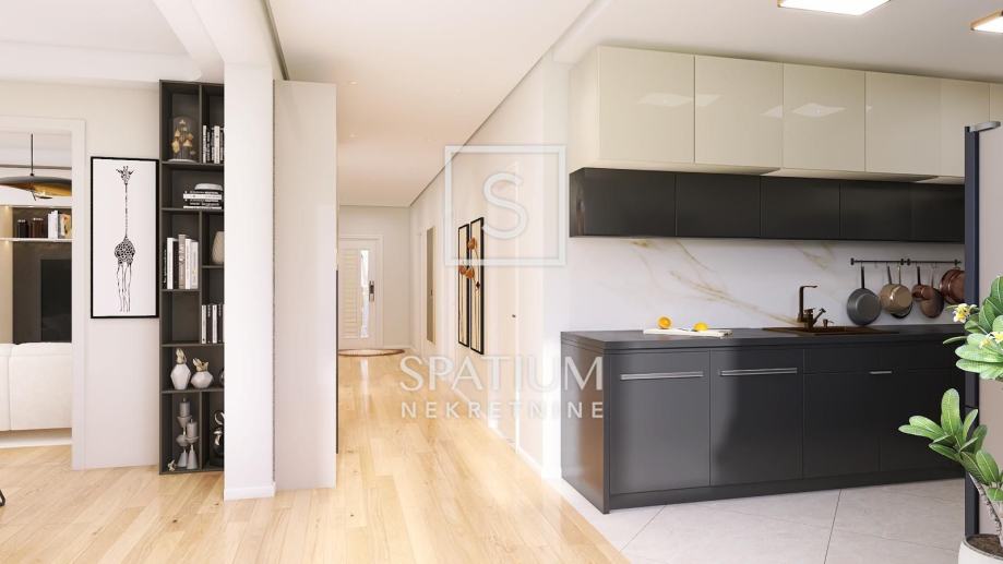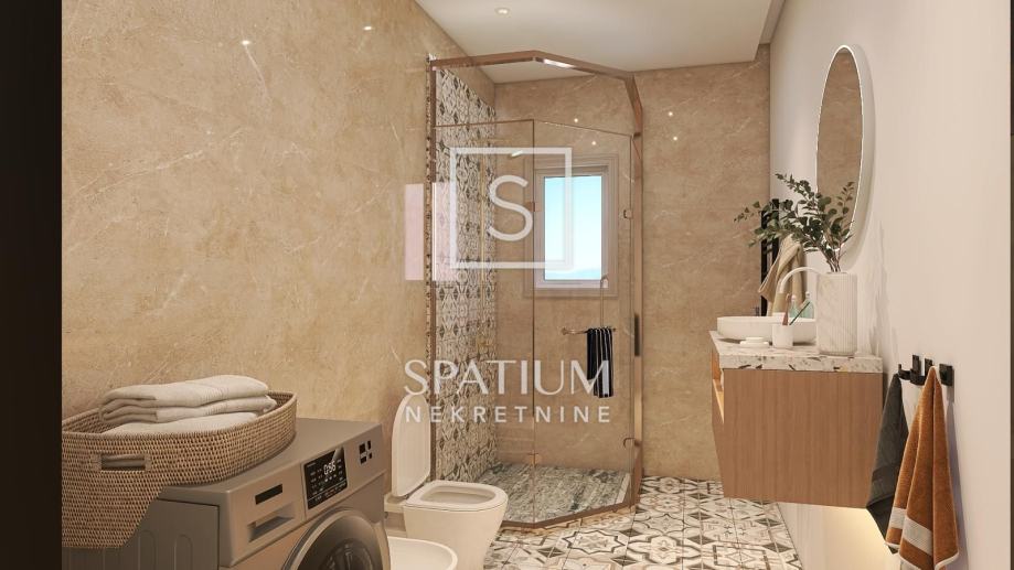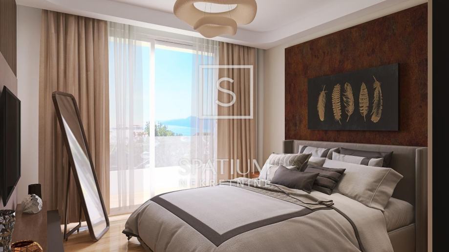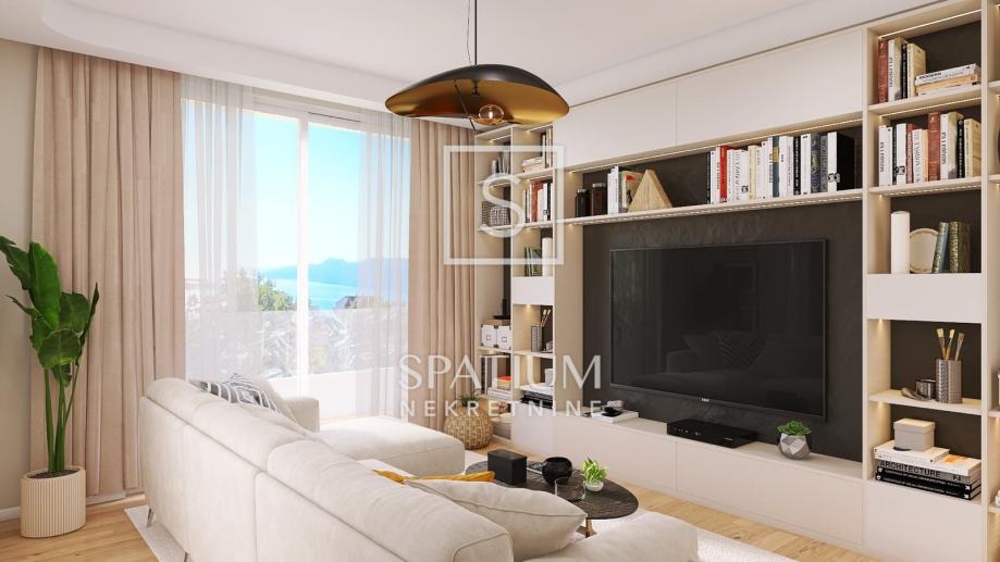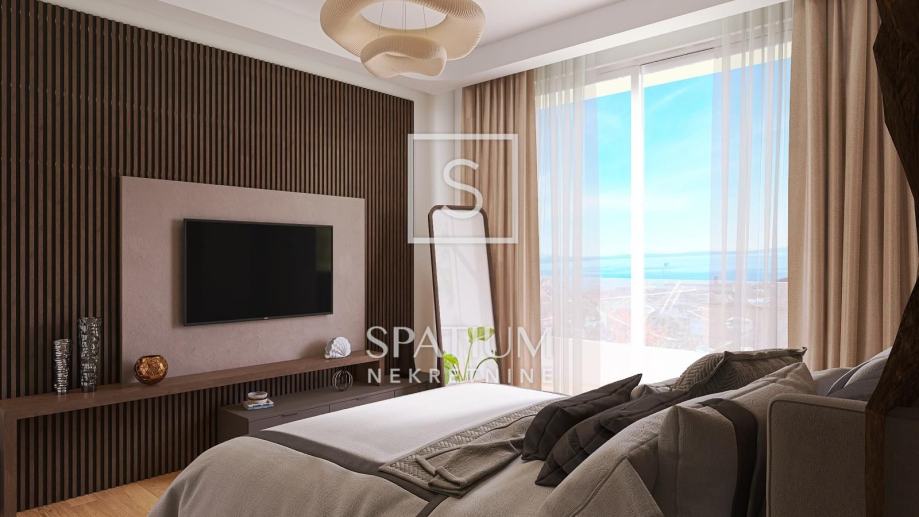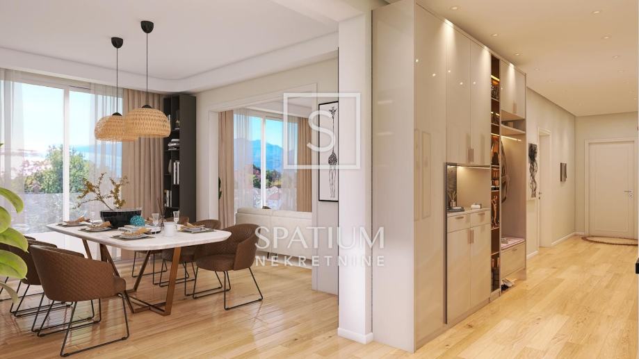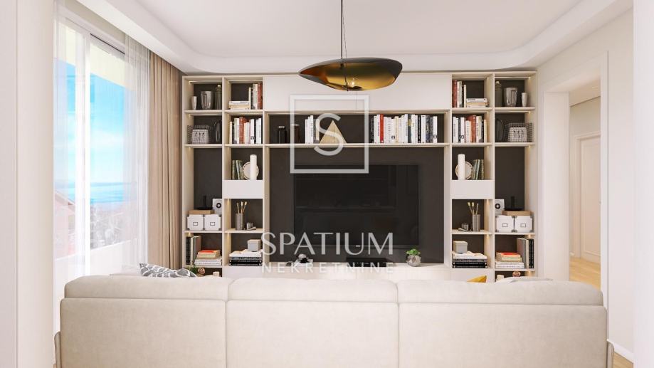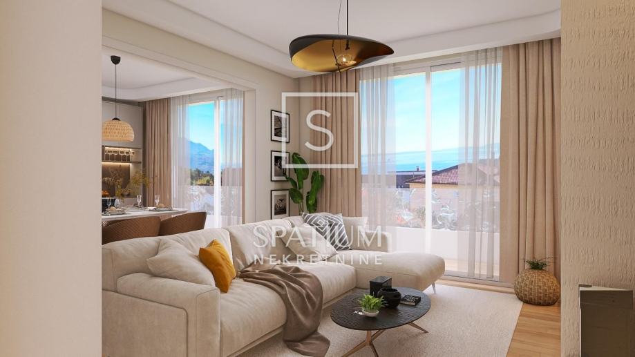Sastoji se od hodnika, kuhinje, velikog dnevnog boravka i blagovaone, jedne veće i dvije manje spavaće sobe, ukupne korisne površine 93,31m2, a pripada mu i natkriveni balkon površine 19,92 m2 s kojeg se pruža pogled na more. Južne je orijentacije što omogućuje puno prirodnog svjetla tijekom cijelog dana. Prodaje se kompletno namješten, a postoji i opcija da se interijer uredi ovisno o želji budućih kupaca. Kao takav idealan je za dugoročno stanovanje ili za turistički najam, što čini ovu nekretninu savršenom investicijom te idealnom za veću obitelj.