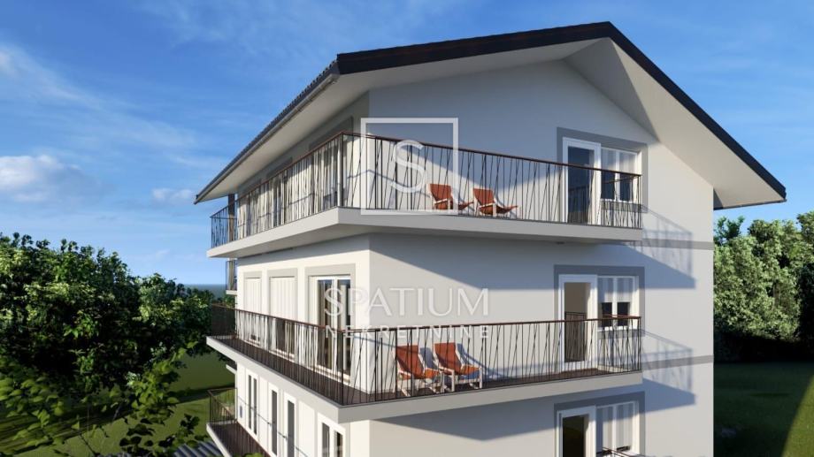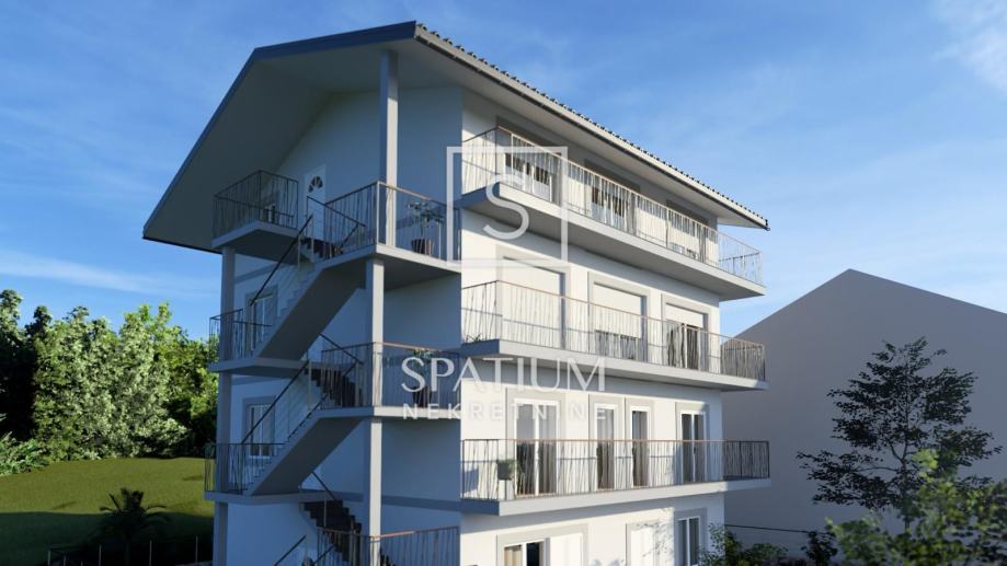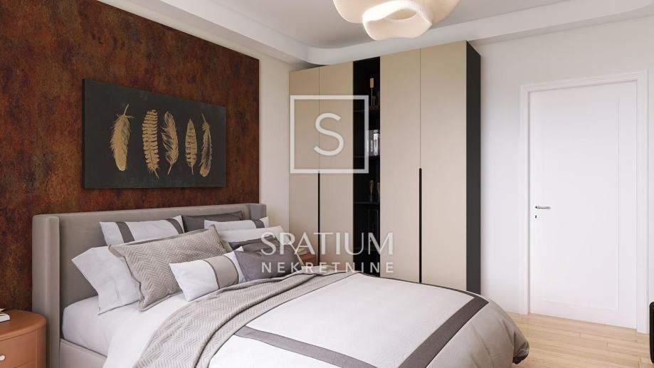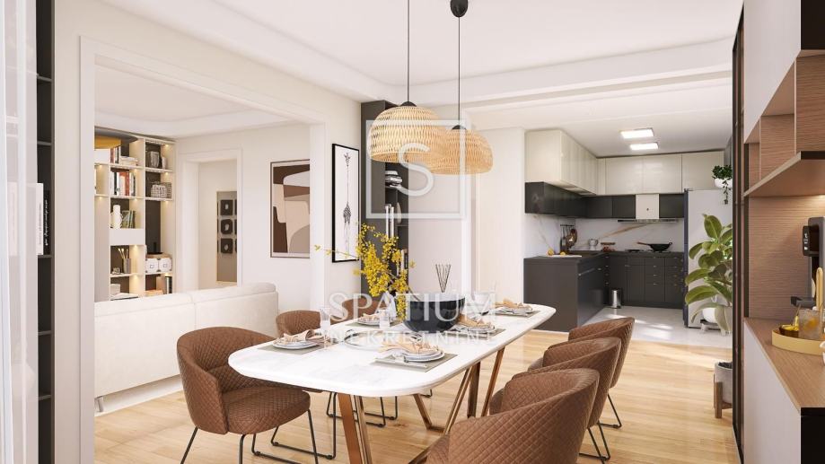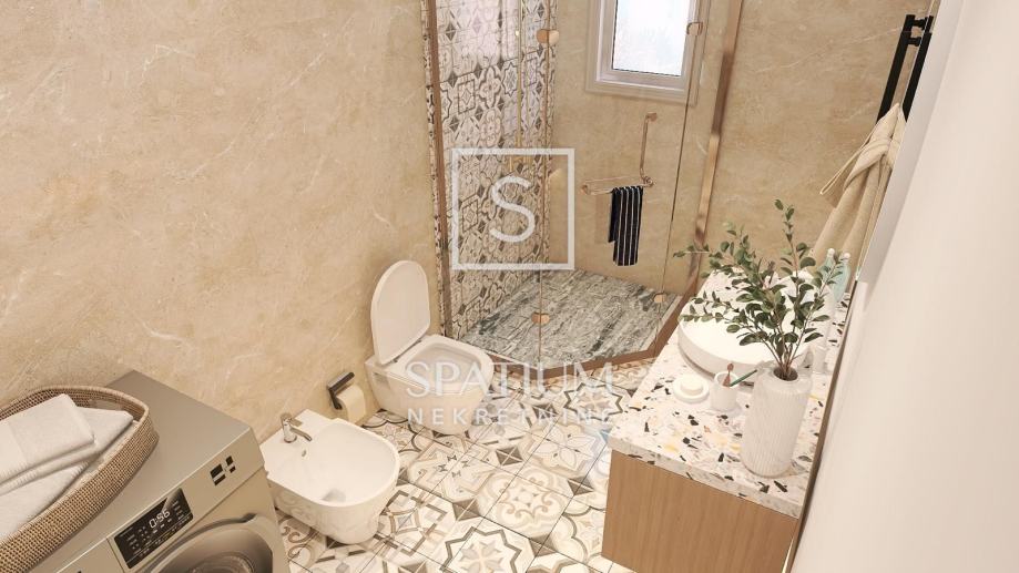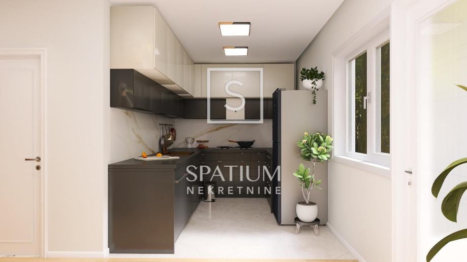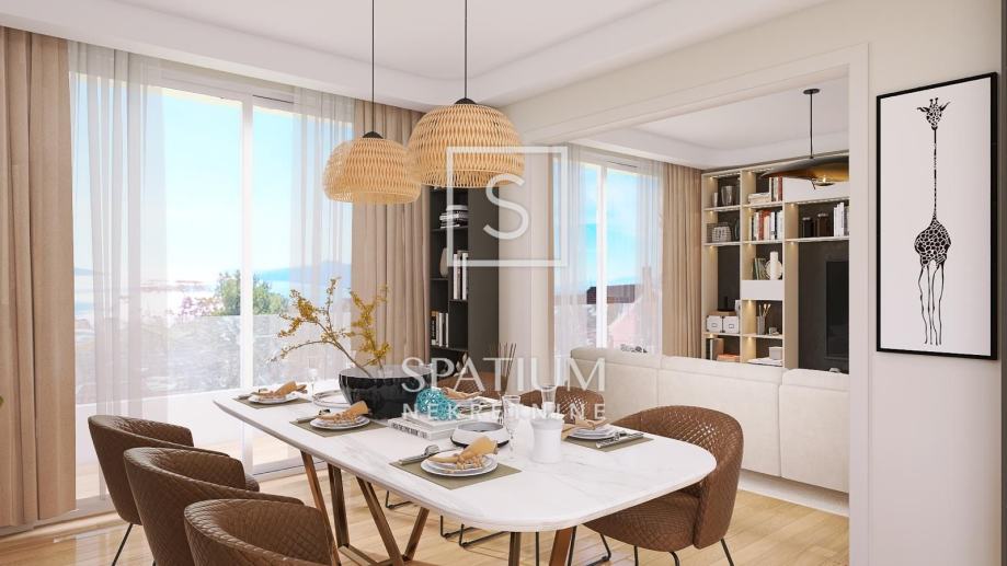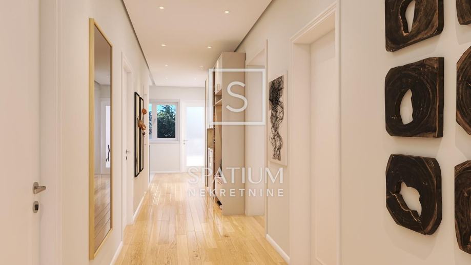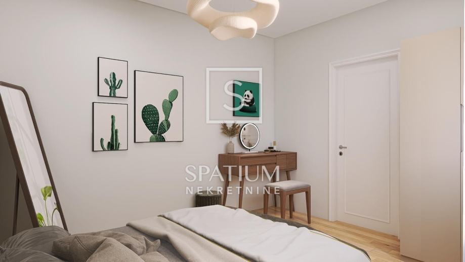 Sastoji se od hodnika, kuhinje, velikog dnevnog boravka i blagovaone, jedne veće i dvije manje spavaće sobe, ukupne korisne površine 93,31m2, a pripada mu i natkriveni balkon površine 19,92 m2 s kojeg se pruža pogled na more. Južne je orijentacije što omogućuje puno prirodnog svjetla tijekom cijelog dana. Prodaje se kompletno namješten, a postoji i opcija da se interijer uredi ovisno o želji budućih kupaca. Kao takav idealan je za dugoročno stanovanje ili za turistički najam, što čini ovu nekretninu savršenom investicijom te idealnom za veću obitelj.