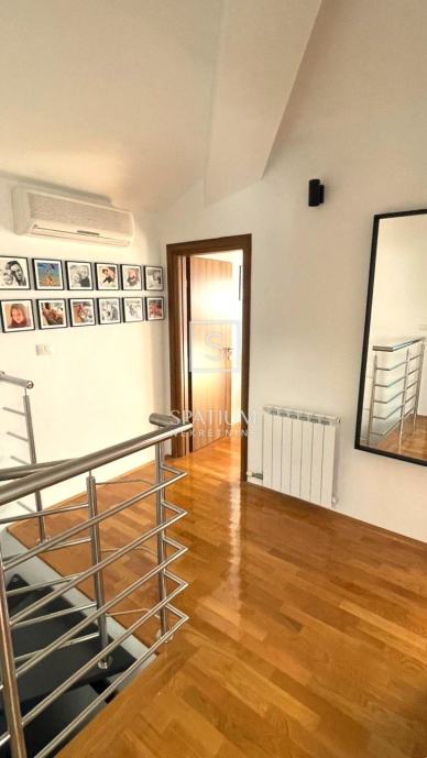 Sastoji se ulaznog hodnika, "open space" kuhinje s blagavaonicom i dnevnim boravkom, kupaonice, toaleta, te jedne spavaće sobe na donjoj etaži dok u visokom potkrovlju nalazimo tri spavaće sobe, predsoblje, kupaonicu i dodatni toalet.