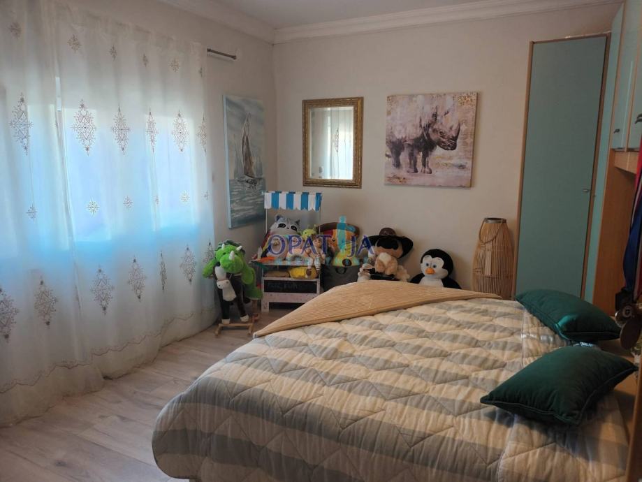 Vanjske stepenice vode na prvi kat s velikom ulaznom terasom. Raspored dvoetažnog stana: hodnik, spavaća soba, kupaona, ostava, dnevni boravak povezan u jednu cjelinu s kuhinjom i blagavaonom, izlaz na balkon s otvorenim pogledom na more.