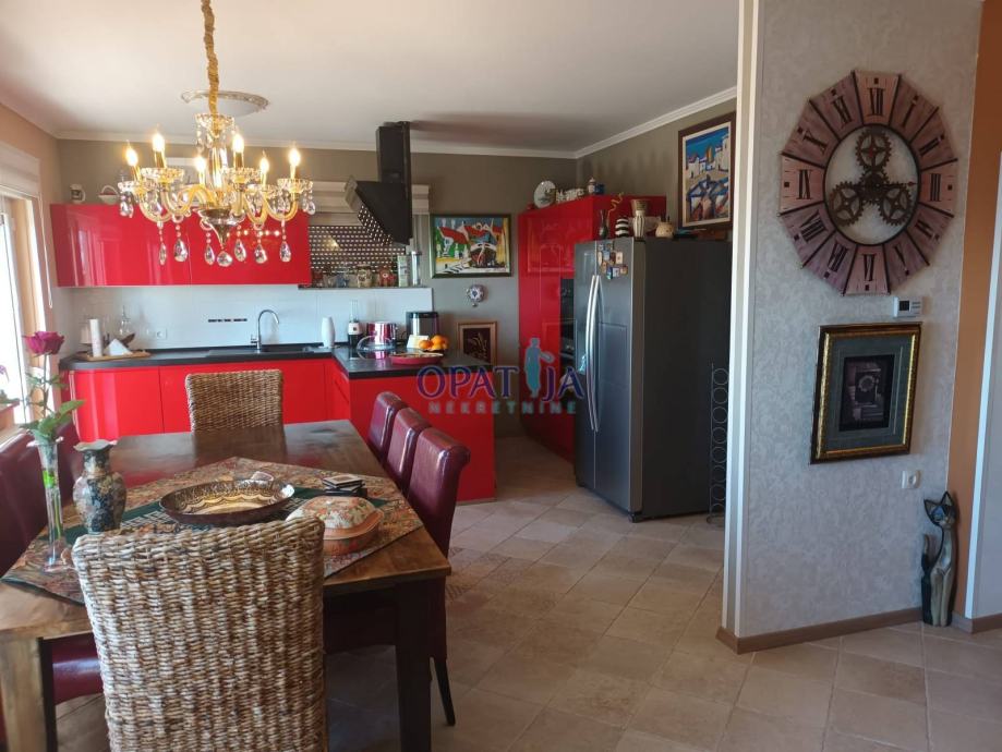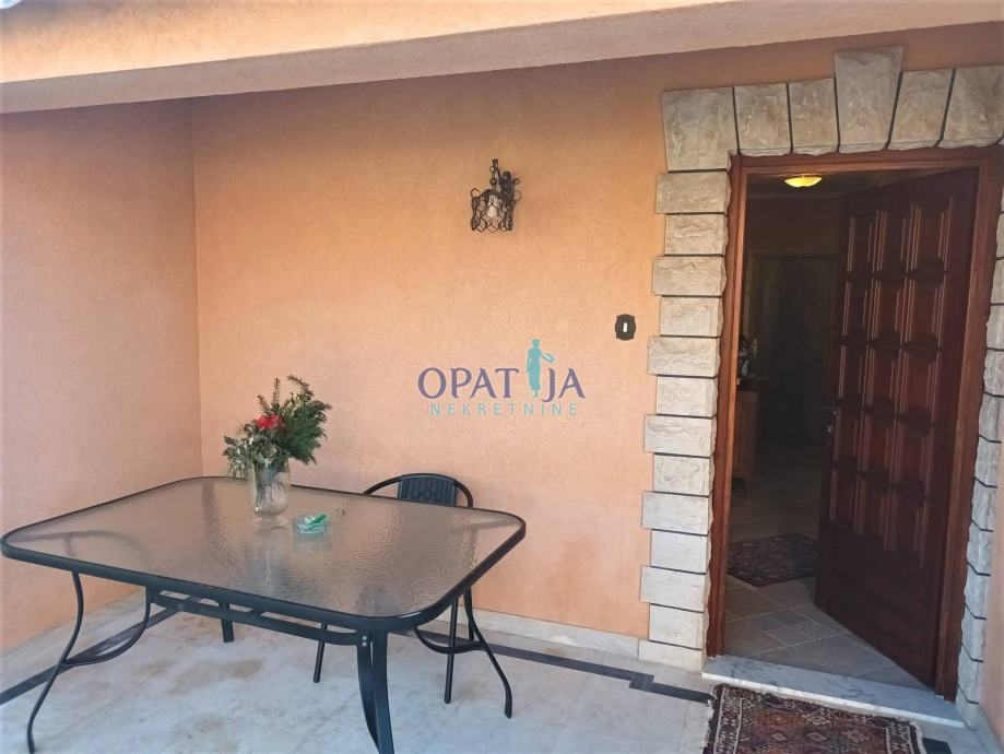 Na lijepoj lokaciji, na ograđenoj okućnici od 1600 m2 opasanoj kamenim zidom i ukrasnom ogradom, s dva dvorišna ulaza, popločenim parkingom za više vozila, garažom, kultiviranom zelenom površinom zasađenom mediteranskim biljem, smještena je obiteljska kuća, adaptirana 2018 g.