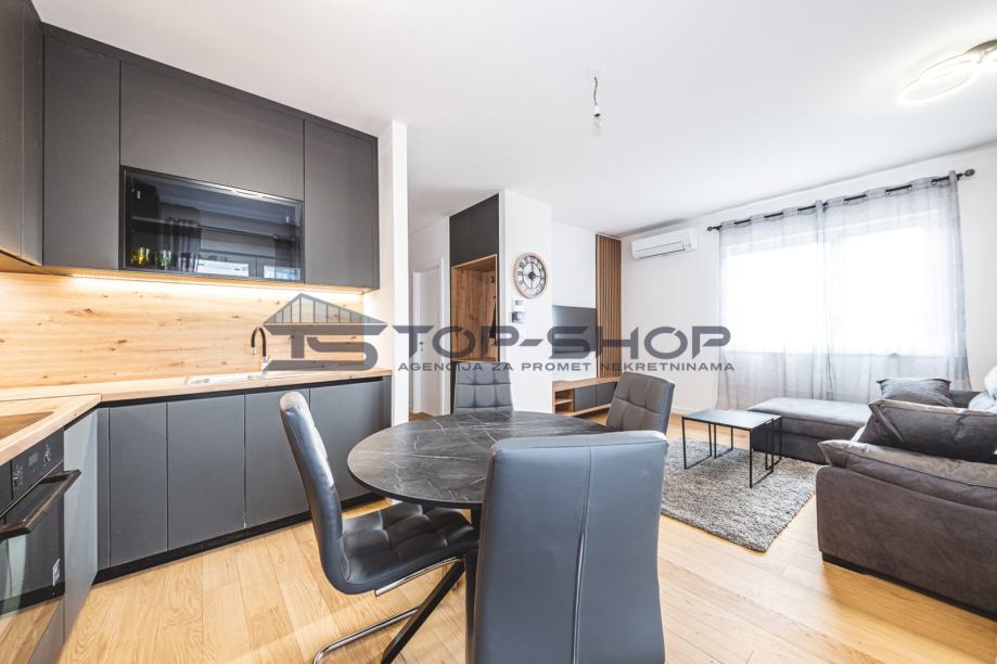 Stan je opremljen modernom kuhinjom s aparatima, perilicom posuđa, perilicom rublja, krevetom i TV-om, što budućim najmoprimcima omogućuje useljenje bez dodatnih ulaganja. Sigurnost je dodatno osigurana protuprovalnim vratima.
