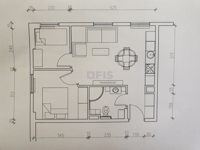 STAN se sastoji od ulaznog hodnika, dnevnog boravka sa kuhinjom i blagavaonom, 2 sobe i kupaone, što čini ukupnu kvadraturu od 43.26m2.