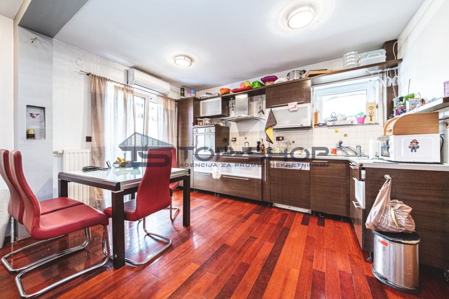 Na prvom katu se nalazi hodnik, opremljena kuhinja sa blagavaonom i dnevnom sobom i kupaona sa jacuzi kadom i terasa.