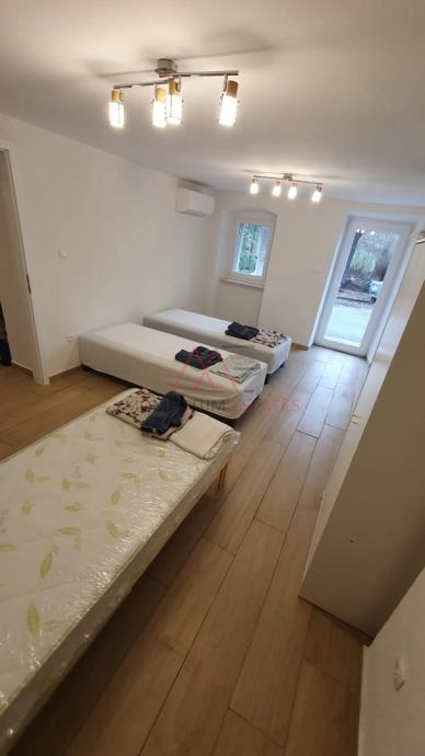 Kucu cine 2 odvojana stana. Jedan ima 4 sobe, 2 kupaone sa wc, perilica rublja, posuđa, kuhinja sa pratecim uređajima, dnevni boravak. Nova stolarija i namjestaj. Svaka soba ima svoj tv.Tri su velike sobe sa po tri lezaja i jedna manja sa jednim lezajem. Grijanje u svakoj sobi klima uređaj u dnevnom boravku podno grijanje. Drugi stan čine dvije sobe dnevnini boravak, kupaona sa wc i kuhinja sa pratecim uređajima. Klima, tv, perilece rublja, perilice posuđa...(drugi stan se iznajmljuje od 1.3.). Sa mjestima za parkiranje u blizini kuce.