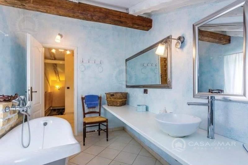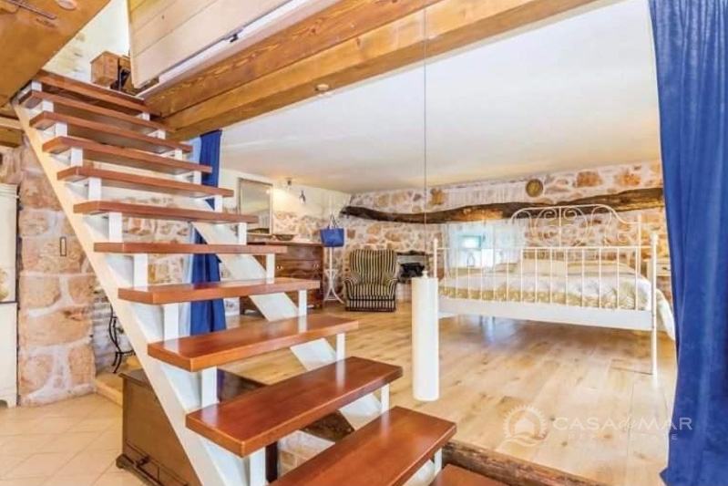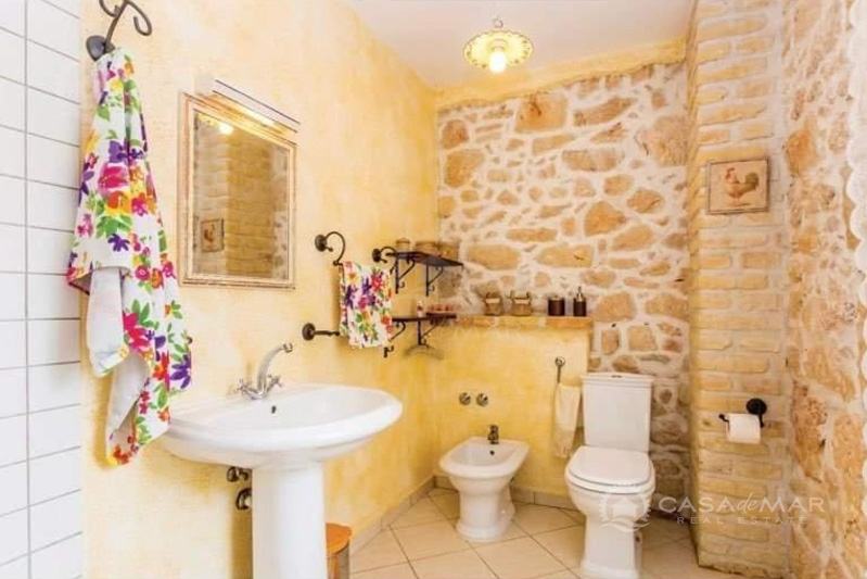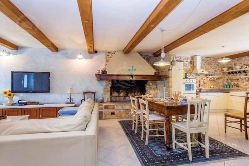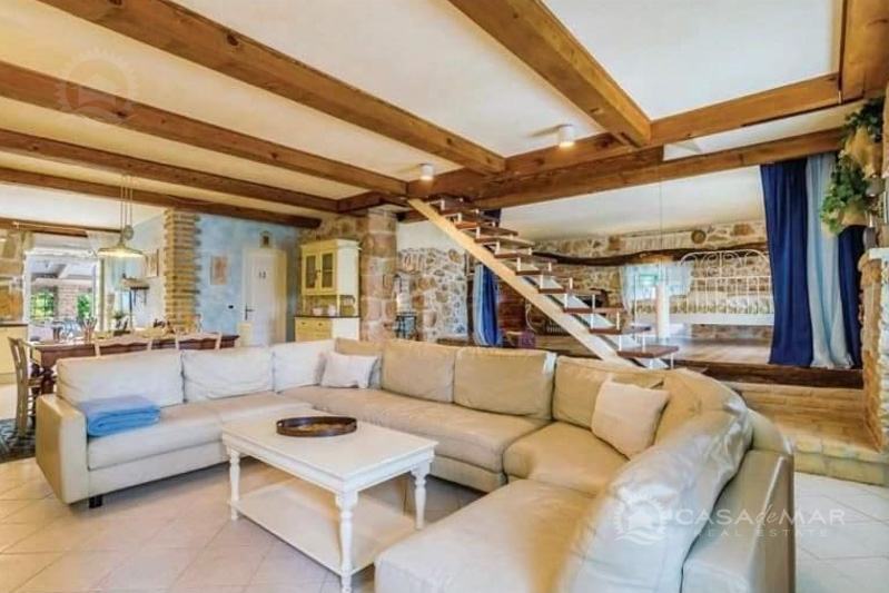 Kuća se prostire na tri etaže: prizemlje, kat i visoko potkrovlje. U prizemlju se nalazi konoba s originalnom kamenom prešom za preradu maslina, autentičan detalj koji daje prostoru poseban šarm, tehnička prostorija sa sustavom centralnog grijanja, kupaonica i dodatna mala kuhinja. Vanjskim stubištem dolazi se na prvi kat, gdje se nalazi prostrani dnevni boravak s kaminom, kuhinja i blagovaonica, kupaonica te galerija koja može služiti kao spavaća, radna soba ili prostor za relaksaciju. Iz dnevnog boravka izlazi se na dvije terase, jedna vodi prema bazenu i okućnici, a druga nudi mir i privatnost na suprotnoj strani kuće. U visokom potkrovlju nalaze se tri spavaće sobe i dodatna kupaonica, pružajući dovoljno prostora za obitelj ili goste.