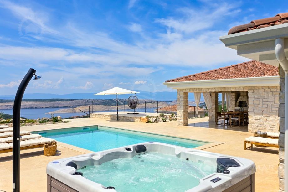 Na terasi ove mediteranske vile se nalazi sve što Vam je potrebno za savršeno opuštanje, druženje i uživanje. Bazen od čak 35 m2 obložen keramikom je dodatno opremljen grijanjem i elektrolizom vode, a za one koje uživaju u masažama nalazi se i jacuzzi za 6 osoba. Oko bazena se nalazi sunčalište sa ležaljkama, a pod natkrivenom terasom se smjestio vanjski stol za jelo od slavonskog hrasta te zidani kameni roštilj.