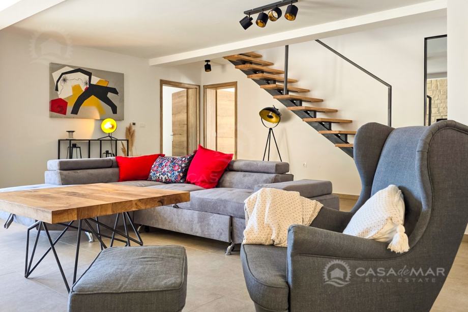 Iako rustikalnog dizajna, vila je izgrađena 2024. godine, sa kvalitetnim istarskim kamenom Kanfanar. Spajajući mediteran i luksuz, opremljena je modernim namještajem, klimatizacijskim sustavom, podnim grijanjem i dizalicom topline, a za romantične večeri postoji i mogućnost grijanja na kamin.