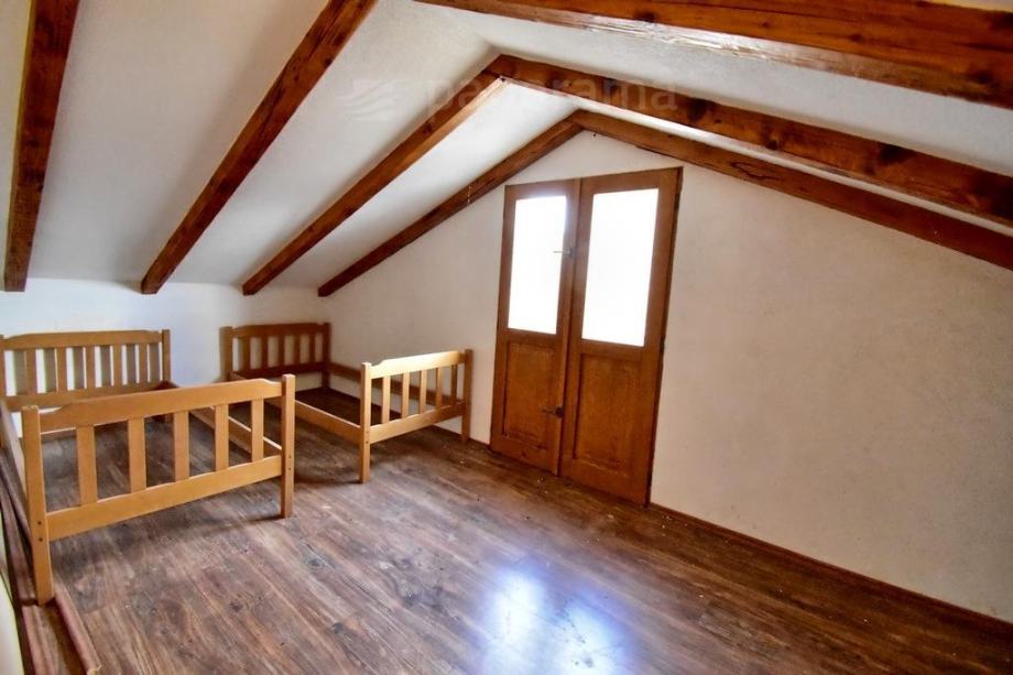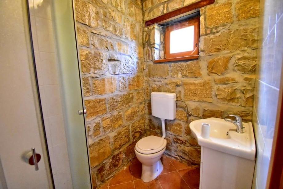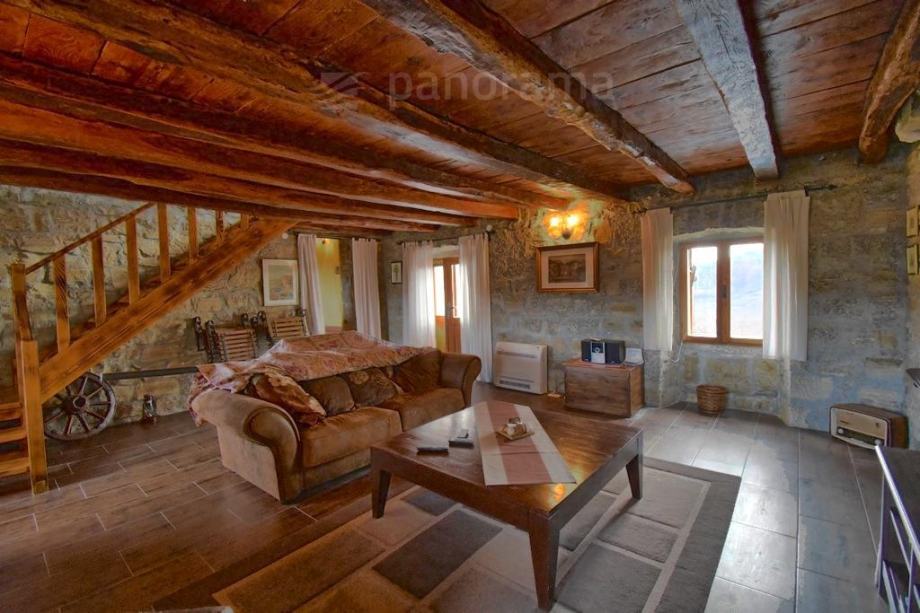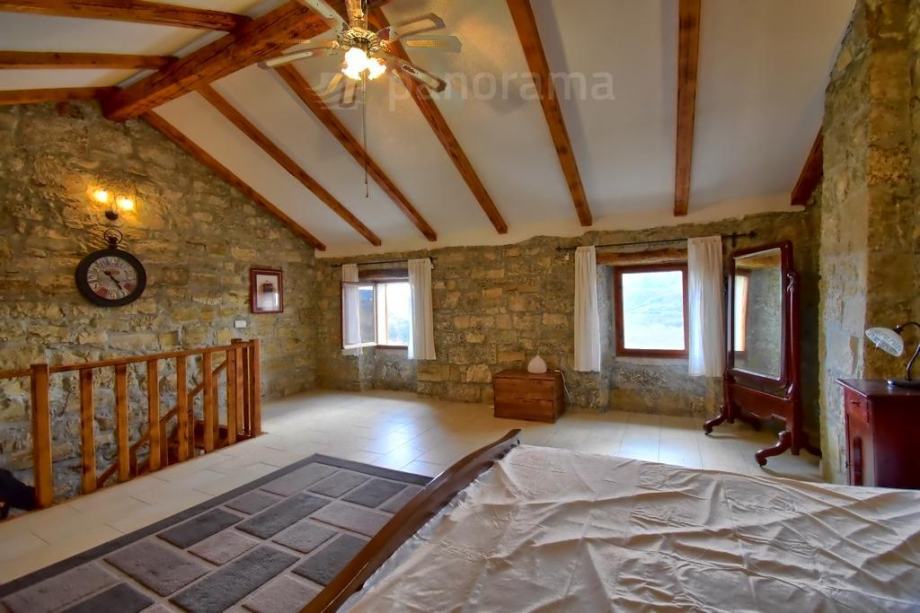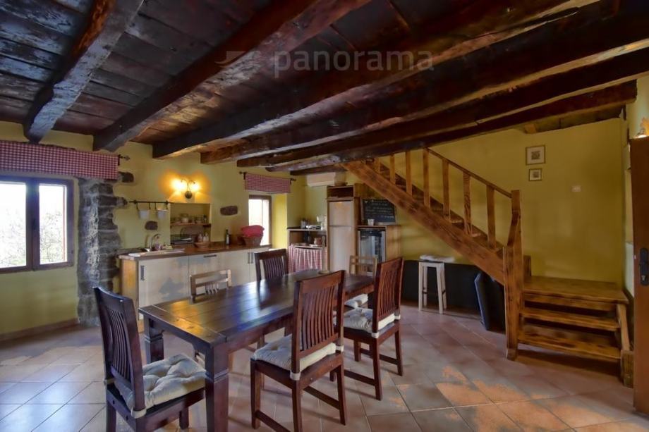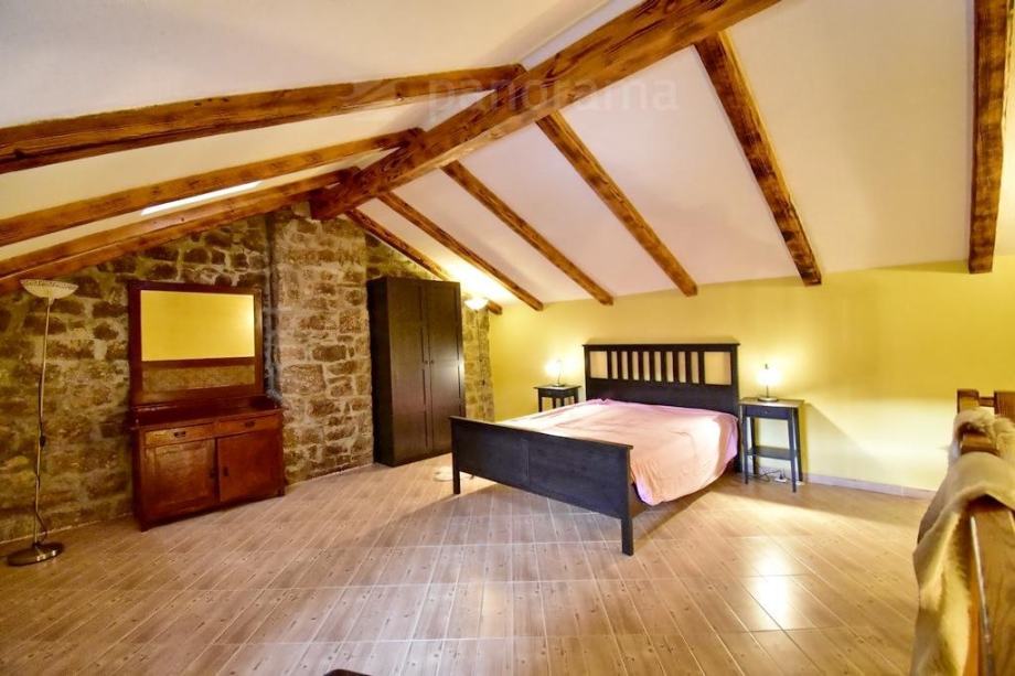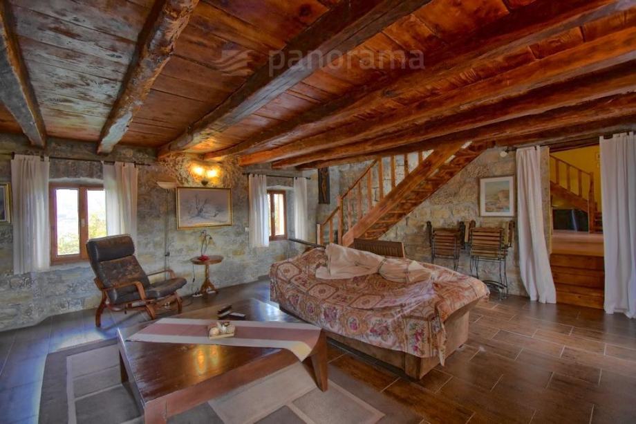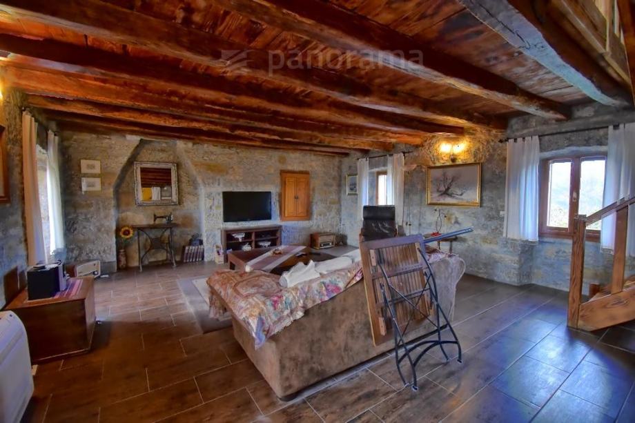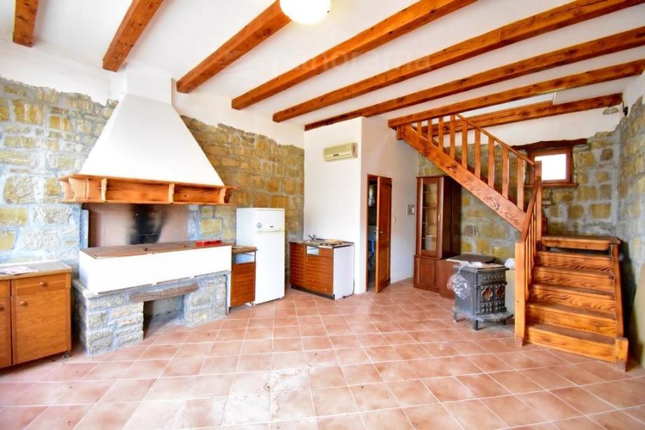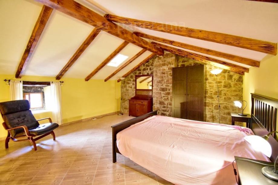 Kuća je kamena, stara 200-tinjak godina, vezana jednom stranom i detaljno renovirana 2014.godine. Renovacija je rađena na način da se sve što se moglo ostavilo izvornim, a opet prilagođeno današnjim zahtjevima življenja. Objekt ima cca 60m2 po etaži, ukupno 180m2. U prizemlju se nalazi konoba, kao 2 prostorije sa 2 izlaza i koja može biti prenamijenjena u stan. Na 1.kat se ide zasebnim vanjskim stubištem gdje se nalazi kuhinja s blagovaonicom, dnevna soba i kupaonica. Na 2.katu su 2 izuzetno velike spavaće sobe. Kuća je namještena rustikalnim namještajem u skladu sa interijerom i većina tog namještaja ostaje u kući. Na 1.katu s nalazi veliki otvoreni kamin, a ima i klimu za grijanje i hlađenje.