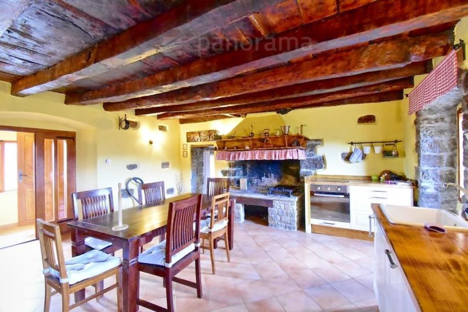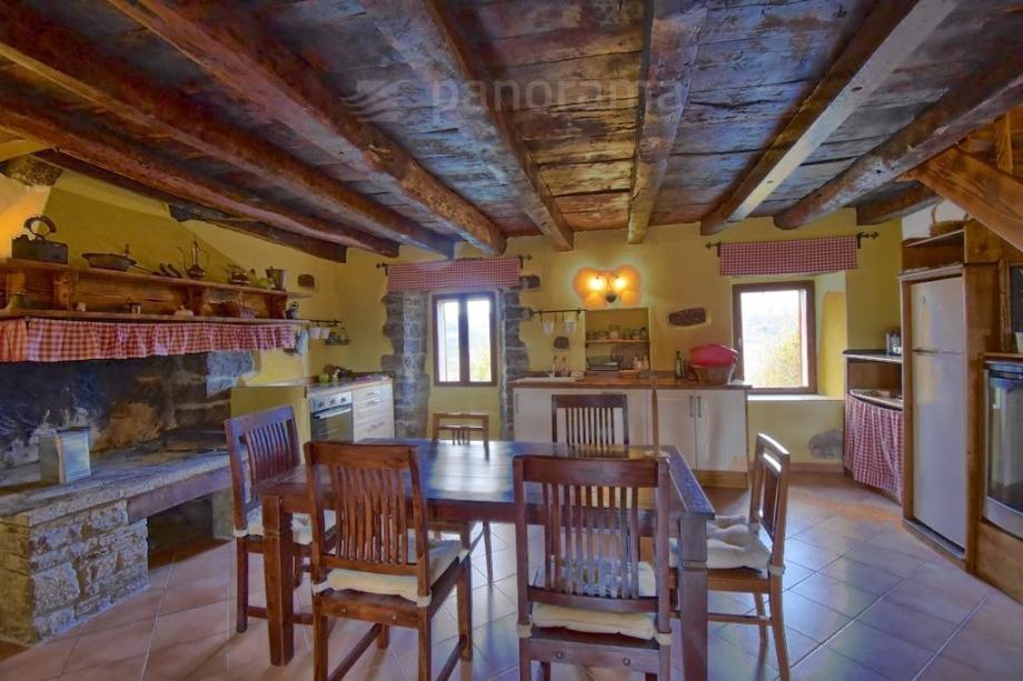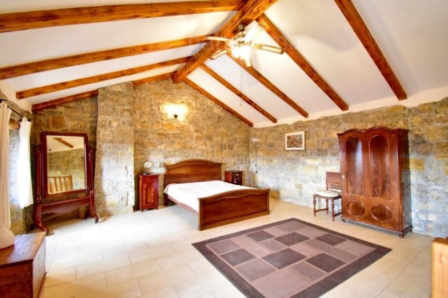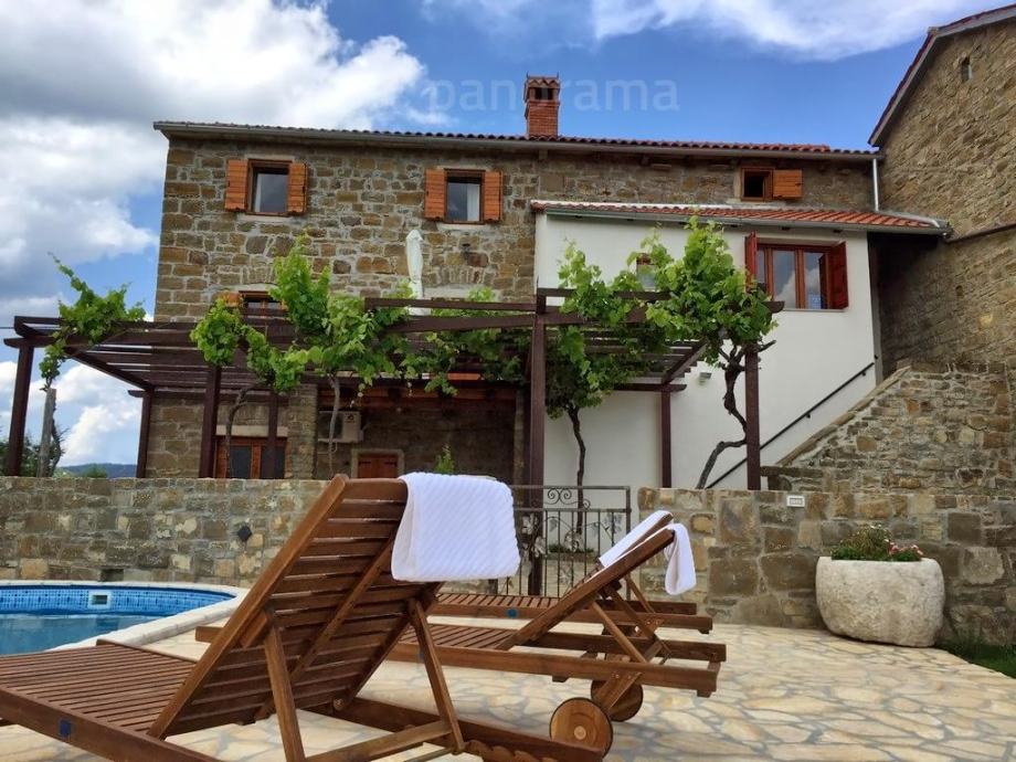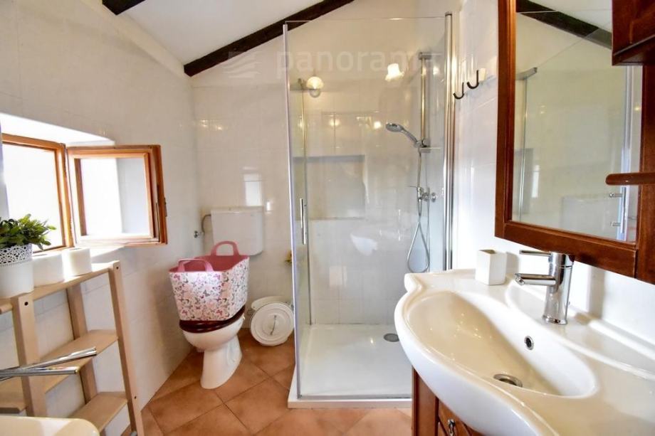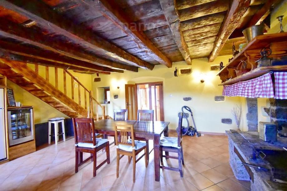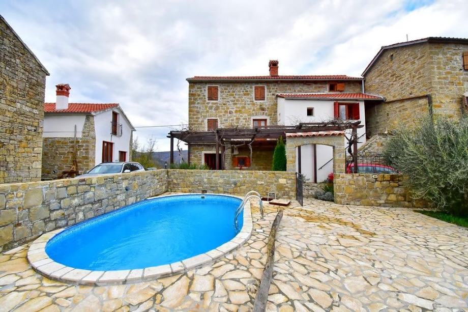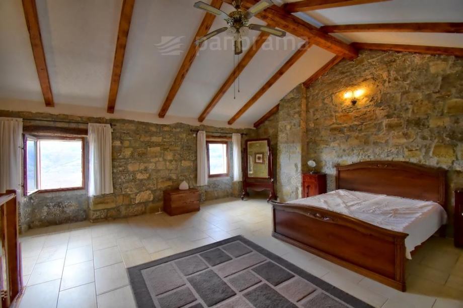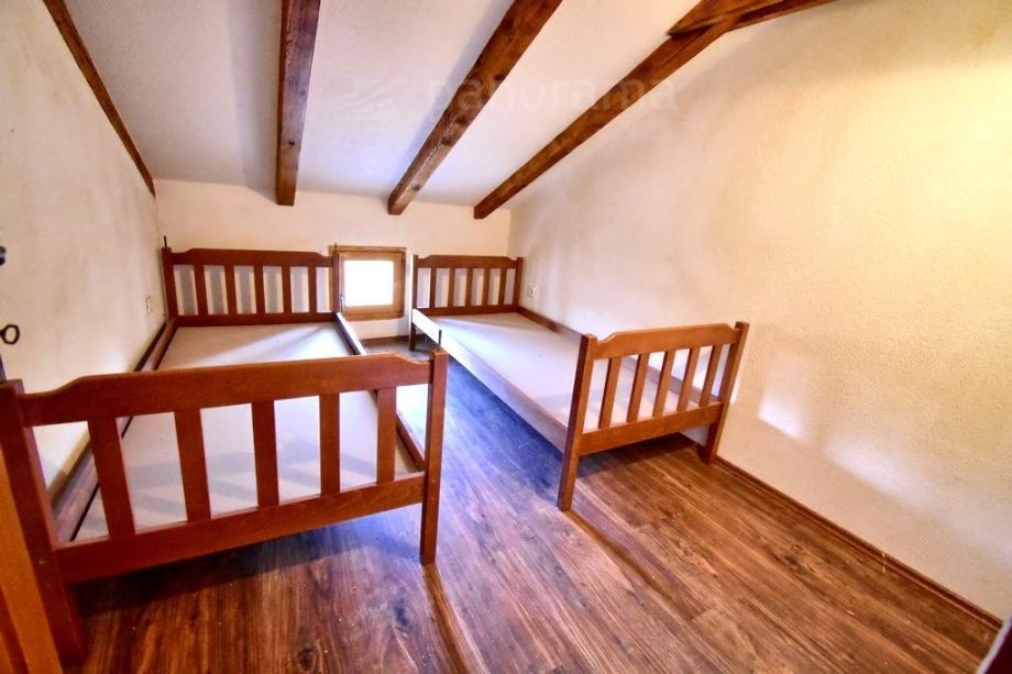 Kuća je kamena, stara 200-tinjak godina, vezana jednom stranom i detaljno renovirana 2014.godine. Renovacija je rađena na način da se sve što se moglo ostavilo izvornim, a opet prilagođeno današnjim zahtjevima življenja. Objekt ima cca 60m2 po etaži, ukupno 180m2. U prizemlju se nalazi konoba, kao 2 prostorije sa 2 izlaza i koja može biti prenamijenjena u stan. Na 1.kat se ide zasebnim vanjskim stubištem gdje se nalazi kuhinja s blagovaonicom, dnevna soba i kupaonica. Na 2.katu su 2 izuzetno velike spavaće sobe. Kuća je namještena rustikalnim namještajem u skladu sa interijerom i većina tog namještaja ostaje u kući. Na 1.katu s nalazi veliki otvoreni kamin, a ima i klimu za grijanje i hlađenje.
