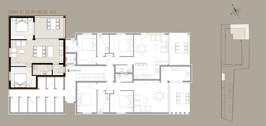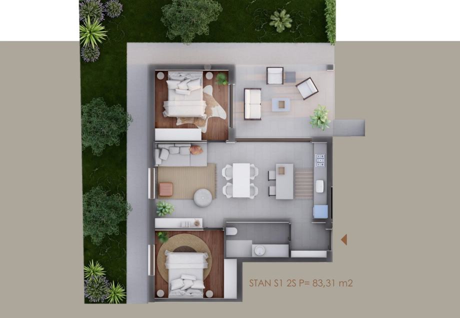 Tlocrt je iznimno funkcionalan: pri ulazu nalazi se hodnik, iz kojeg se pristupa dvije odvojene spavaće sobe i kupaonici. Dnevni dio čini prostrani i svijetli otvoreni dnevni boravak s kuhinjom i blagovaonicom, koji je dizajniran tako da pruža puno prirodnog svjetla i ugodan osjećaj otvorenosti.