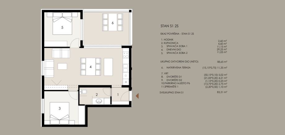 U Privlaci prodajemo moderno i funkcionalno dizajniran 2-sobni stan S1 u prizemlju, koji se nalazi u prvom redu do mora. Stan je dio novog projekta, zgrada je trenutno u izgradnji, a dizajn je usmjeren na udoban život, puno svjetla te kvalitetno iskorišten tlocrt. Ukupna neto površina stana iznosi 83,31 m2.