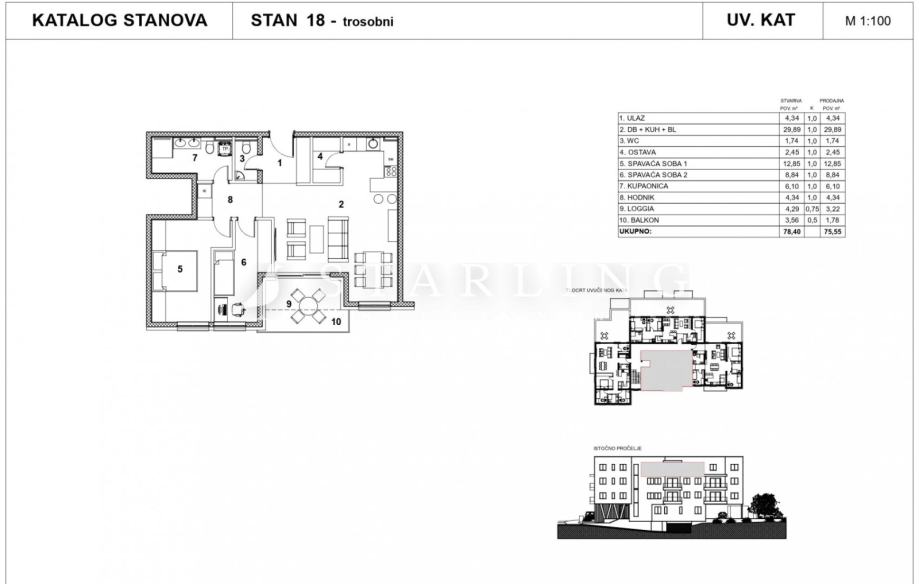 Prodaje se trosoban stan neto stambene površine 76 m2 na trećem katu zgrade s liftom.
