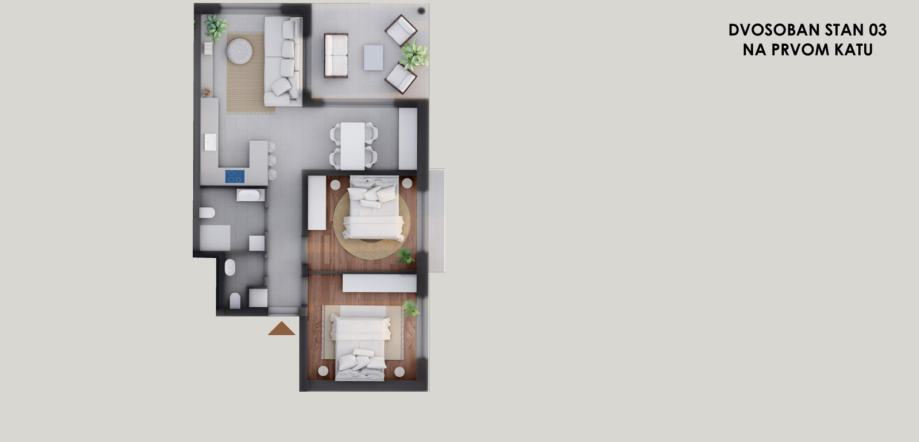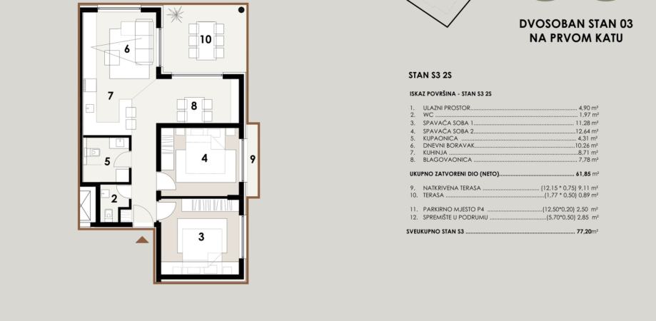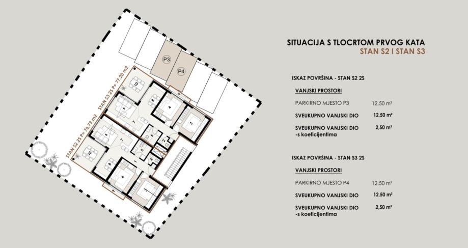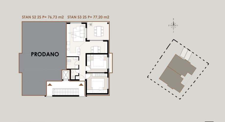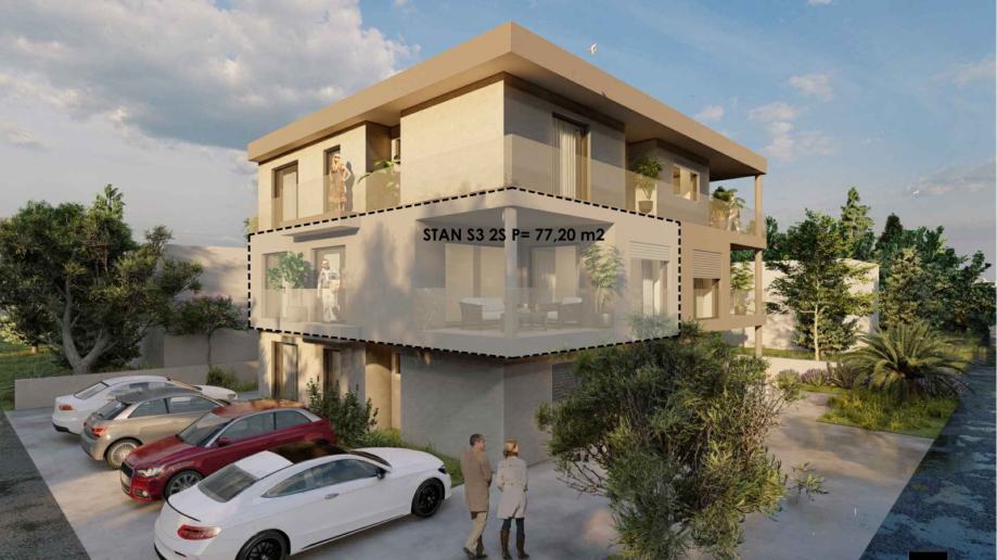 Stan S3 ima 77,20m2 neto korisne površine, odlikuje ga pregledan i funkcionalan tlocrt s odvojenim dnevnim i spavaćim dijelom.