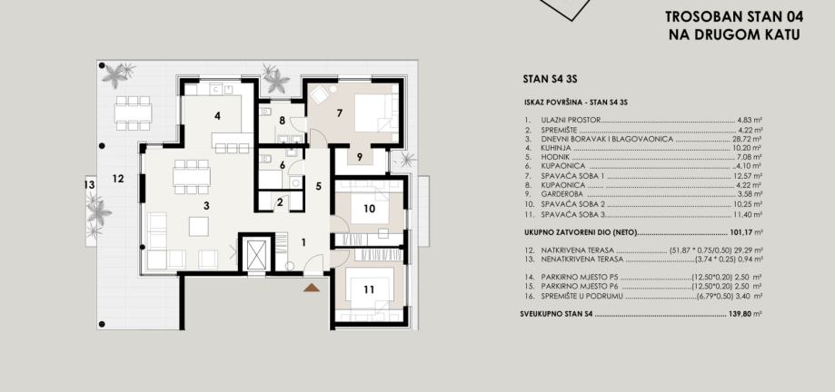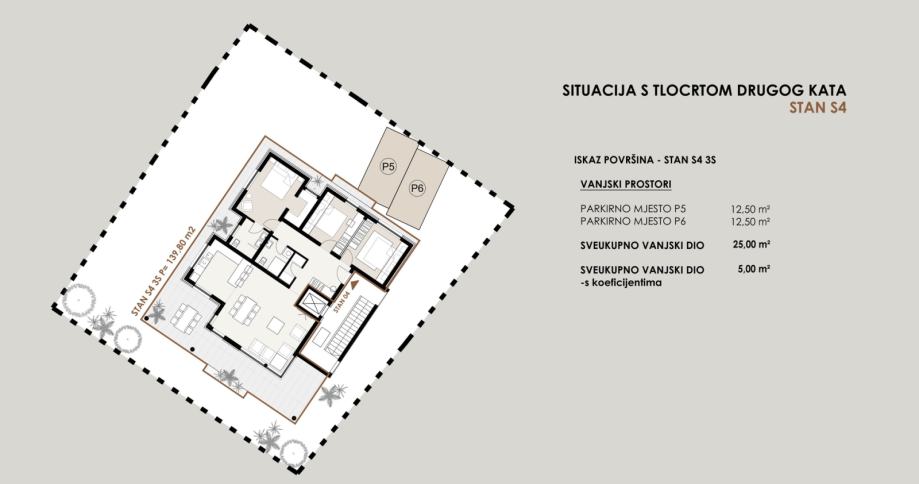 Penthouse ima ukupno 139,80 m2 neto korisne površine te promišljen raspored prostorija s jasno odvojenim dnevnim i spavaćim dijelom.