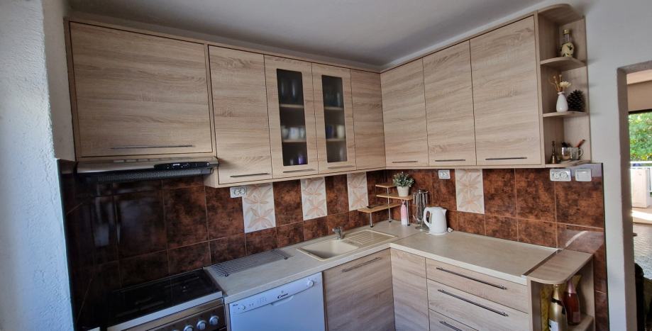 Opremljenost apartmana: hlađenje je na 2 klima uređaja, topla voda na bojler, perilica rublja, u kuhinji perilica posuđa, frižider i štednjak. Kuhinja je kompletno obnovljena 2021 godine. Prodaje se zajedno sa svim namještajem koji se nalazi u apartmanu.