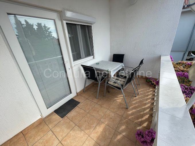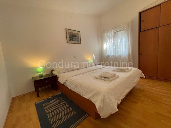 Dvosobni apartman u prizemlju sastoji se od 2 spavaće sobe, kuhinje s dnevnim boravkom i blagavaonicom, kupaonice, toaleta te velike vansjke natkrivene terase.