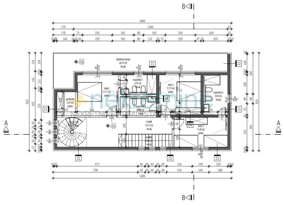 Prvi kat (89,92 m²): tri prostrane spavaće sobe, svaka s vlastitom kupaonicom, uključujući i glavnu spavaću sobu s garderobom, te natkrivena terasa (NKP 12,16 m²).