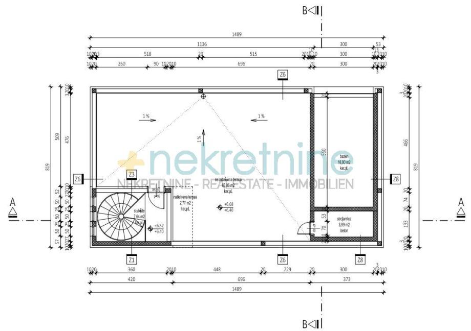 Krovna terasa: nenatkrivena terasa (NKP 17,02 m²) i natkriveni dio (NKP 1,39 m²) s privatnim bazenom – savršeno mjesto za uživanje u suncu i pogledu.