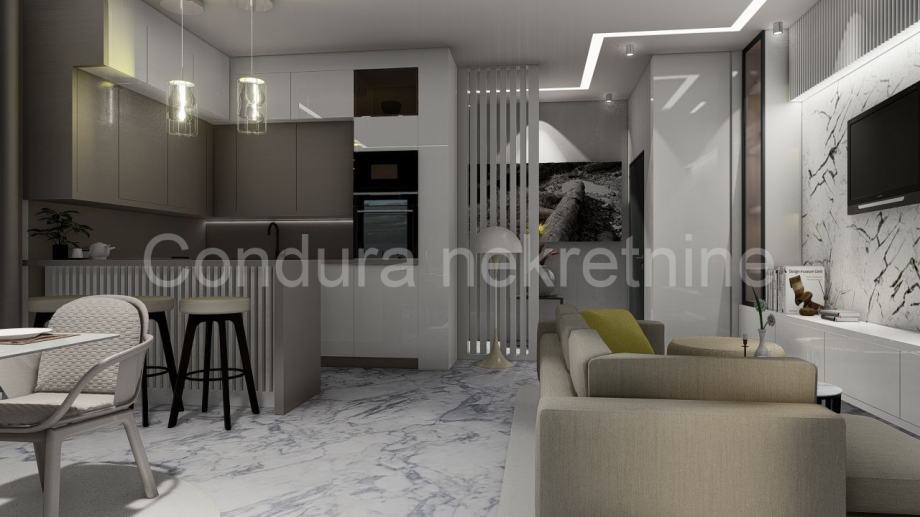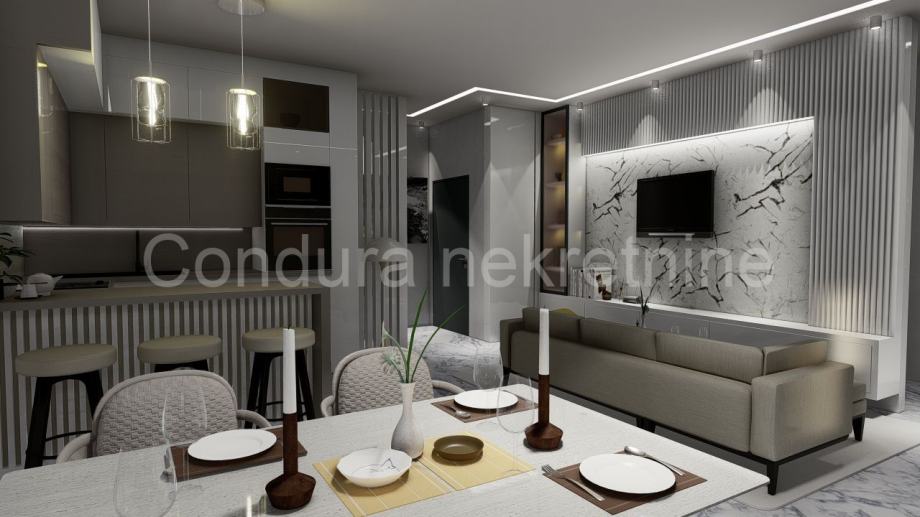 Apartman obiluje prirodnom svjetlošću koju daju prozori od poda do stropa te stvaraju prozračan, svijetao i ugodan ambijent.