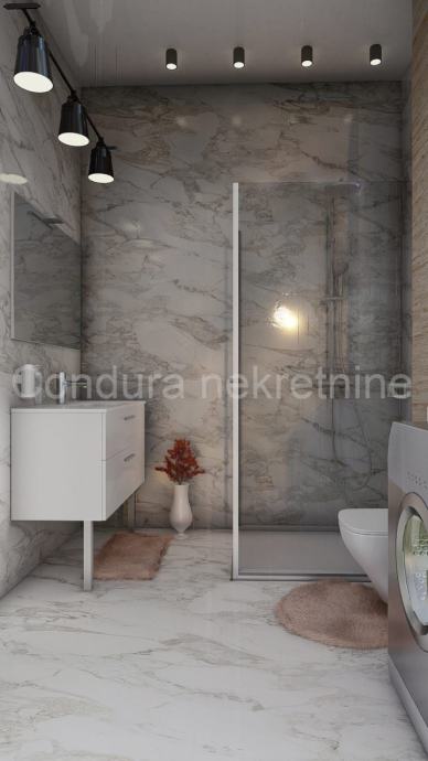 • - podno grijanje u kupaonicama,• - klima uređaji u svim sobama,• - PVC stolarija s roletama i komarnicima,• - podne obloge: kvalitetne keramičke pločice i parket u sobama.