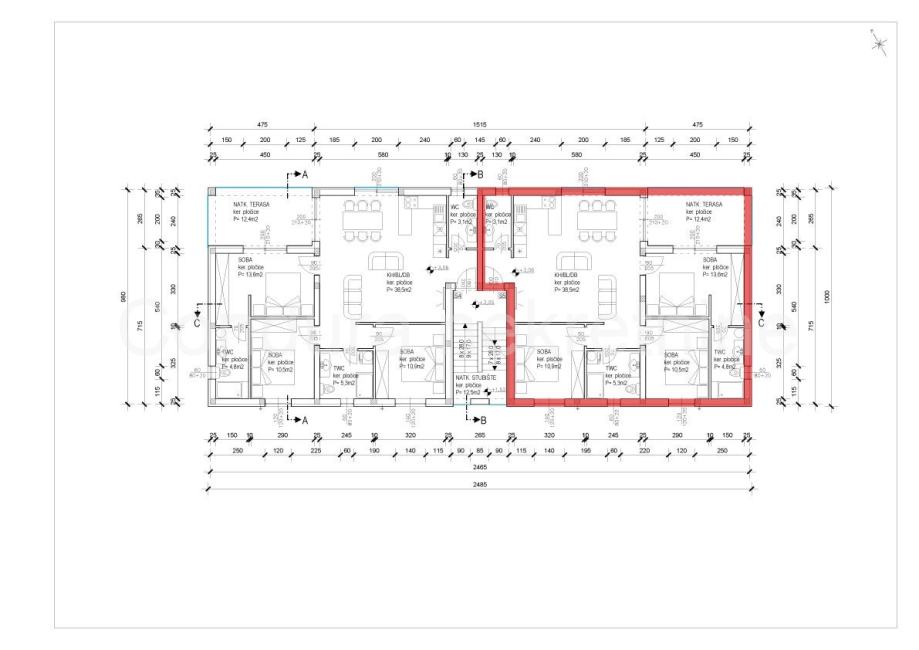 - trosoban apartman S4 površine 99,10 m2 koji se sastoji od dnevnog boravka s kuhinjom i blagovaonicom, tri spavaće sobe, dvije kupaonice, toaleta, hodnika i balkona. Pripada mu i parkirno mjesto u dvorištu. Cijena: 239.000,00 EUR.