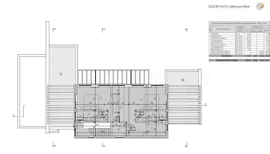 Unutarnje stubište vodi na kat gdje se nalaze dvije spavaće sobe sa vlastitim kupaonicama i garderobama te izlazom na odvojene terase.