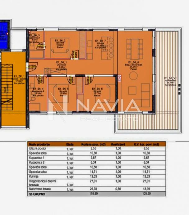 Jedan od najvećih aduta ove nekretnine je velika natkrivena terasa od oko 27 m², koja se proteže oko dvije strane stana te omogućuje korištenje tijekom cijele godine. Terasa je dovoljno prostrana za opuštanje, druženje, objedovanje na otvorenom ili stvaranje svoje privatne oaze, a njezin oblik i orijentacija dodatno naglašavaju otvorenost prostora.