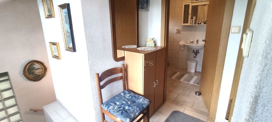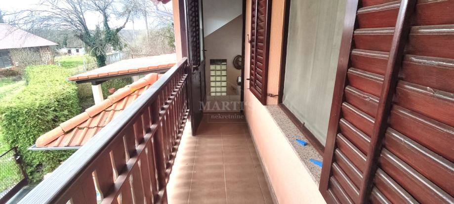 KUĆA 1. KAT: - stubište u 2 niza stepenica, predsoblje, spavaća soba, kupaonica s tuš kadom i perilicom rublja, predivan drveni balkon, dnevna soba s izlazom na prostranu terasu. S balkona i terase predivan je pogled na cijelo imanje, šumarke, brežuljke i udoline.