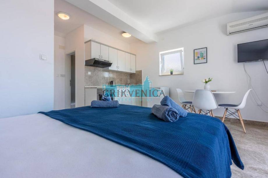 U ponudu smo dobili odličnu nekretninu, garsonijeru svega 200m od mora i uređene plaže sa svim sadržajima (kafići, restoran, pekara, dječje igralište...).