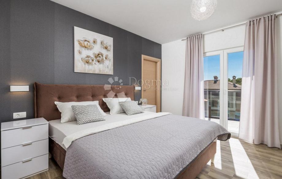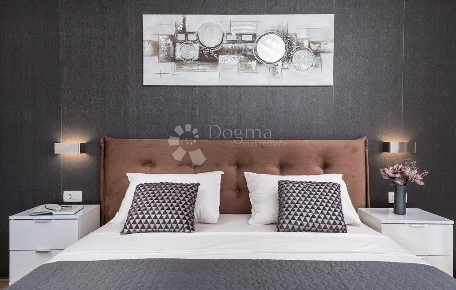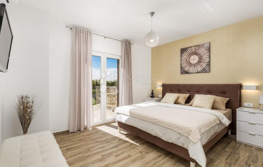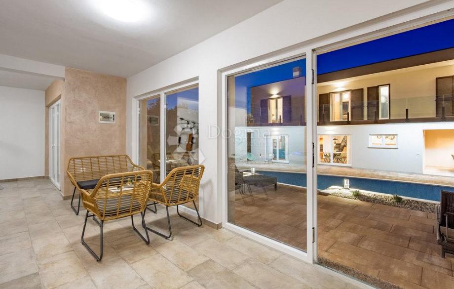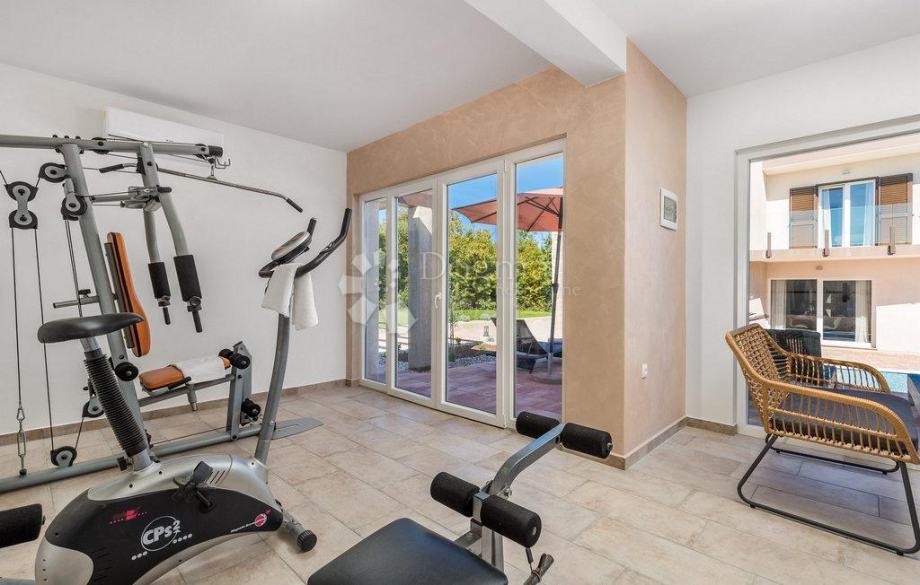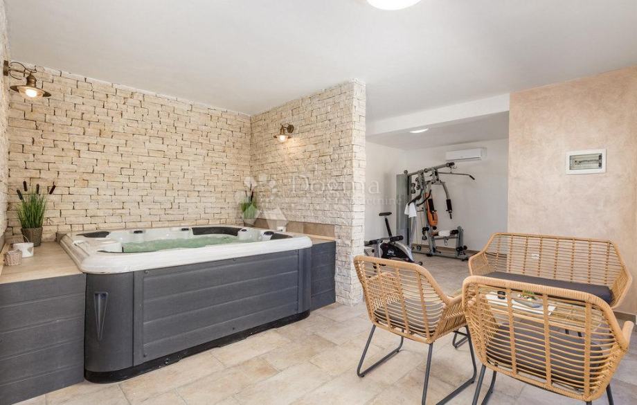 Za dodatnu udobnost tu je i gostinjski toalet, dok poseban luksuz pružaju sauna, prostorija za vježbanje i jacuzzi – smješteni u odvojenom objektu nasuprot vile 50 m², koji s glavnom kućom povezuje elegantni bazen površine 38 m². Oko bazena nalazi se sunčalište s ležaljkama, veliko dvorište s dovoljno prostora za dječju igru te ljuljačke za najmlađe.