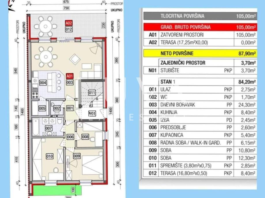 Stan se sastoji od ulaznog prostora, dnevnog boravka s kuhinjom i blagovaonicom, izbe, vešeraja, kupaonice, hodnika, 3 spavaće sobe, te mu pripadaju 2 parkirna mjesta.