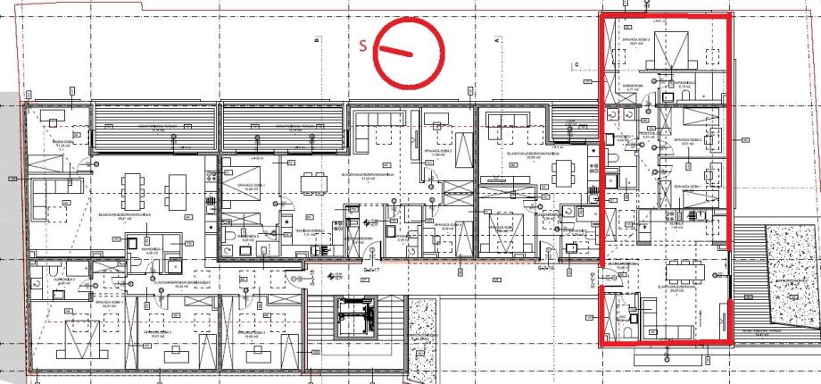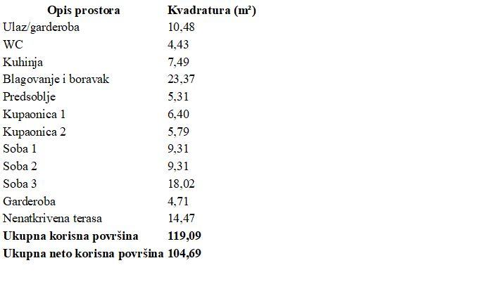 - ČETVEROSOBAN stan na 2. katu orijentacije zapad-istok-jug od 104,69m2 koji se sastoji od ulaznog prostora, garderobe, kuhinje, blagovanja i boravka u openspace varijanti, dvije kupaone, WC-a, predsoblje, tri spavaće sobe, garderobe i nenatkrivene terase.