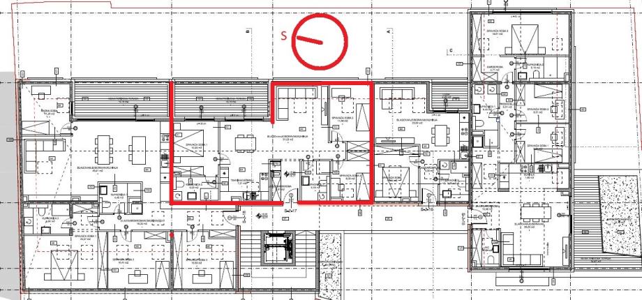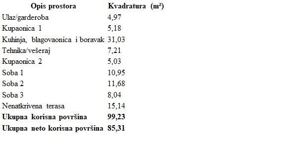 - ČETVEROSOBAN stan na 2. katu orijentacije zapad-istok-jug od 85,31m2 koji se sastoji od ulaznog prostora, garderobe, kuhinje, blagovanja i boravka u openspace varijanti, dvije kupaone, tri spavaće sobe i nenatkrivene terase.