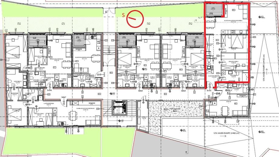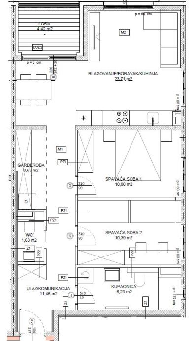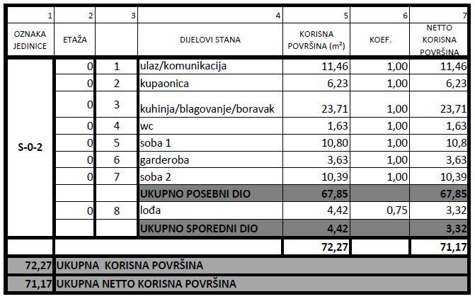 - TROSOBAN stan u prizemlju orijentacije istok-jug od 71,17m2 koji se sastoji od ulaznog prostora, kuhinje, blagovanja i boravka u openspace varijanti, kupaone, WC-a, dvije spavaće sobe, garderobe i lođe.